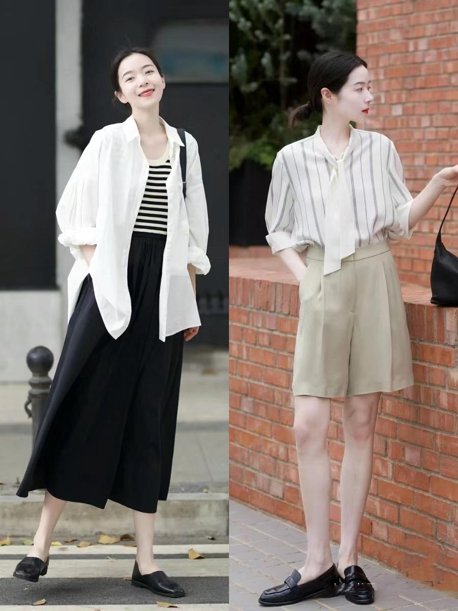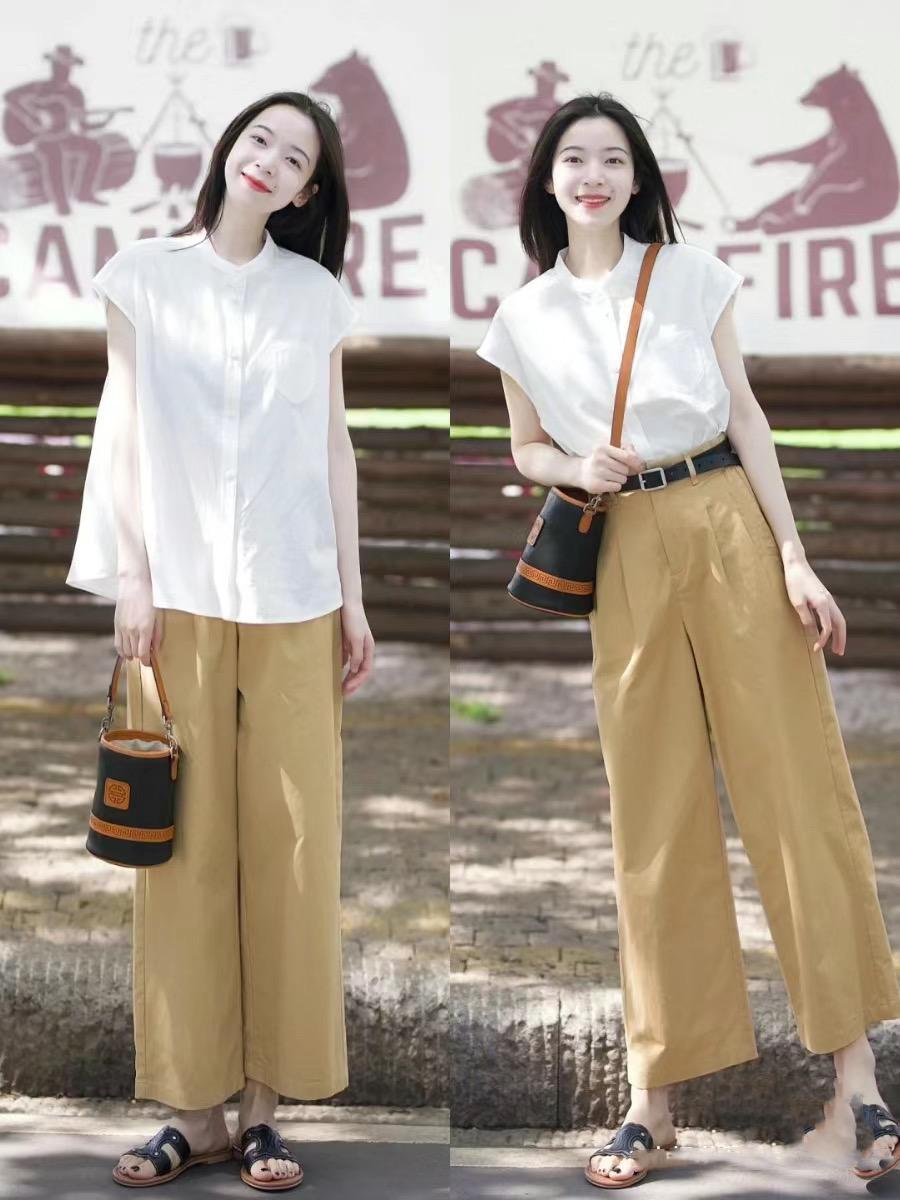 夏天裏的小飛袖襯衫,自帶清涼觸感、可以讓我們的穿搭變得格外輕盈。小飛袖的白襯衫,配上小豎領的設計,就特別的考究精緻,大卡其色直筒褲文藝清新。