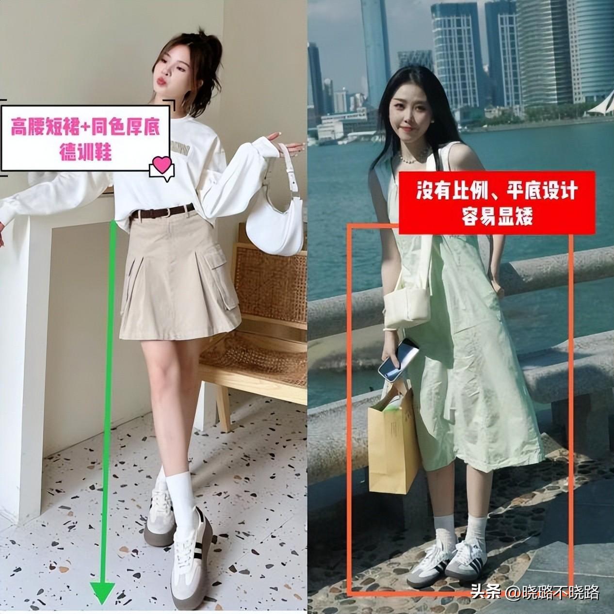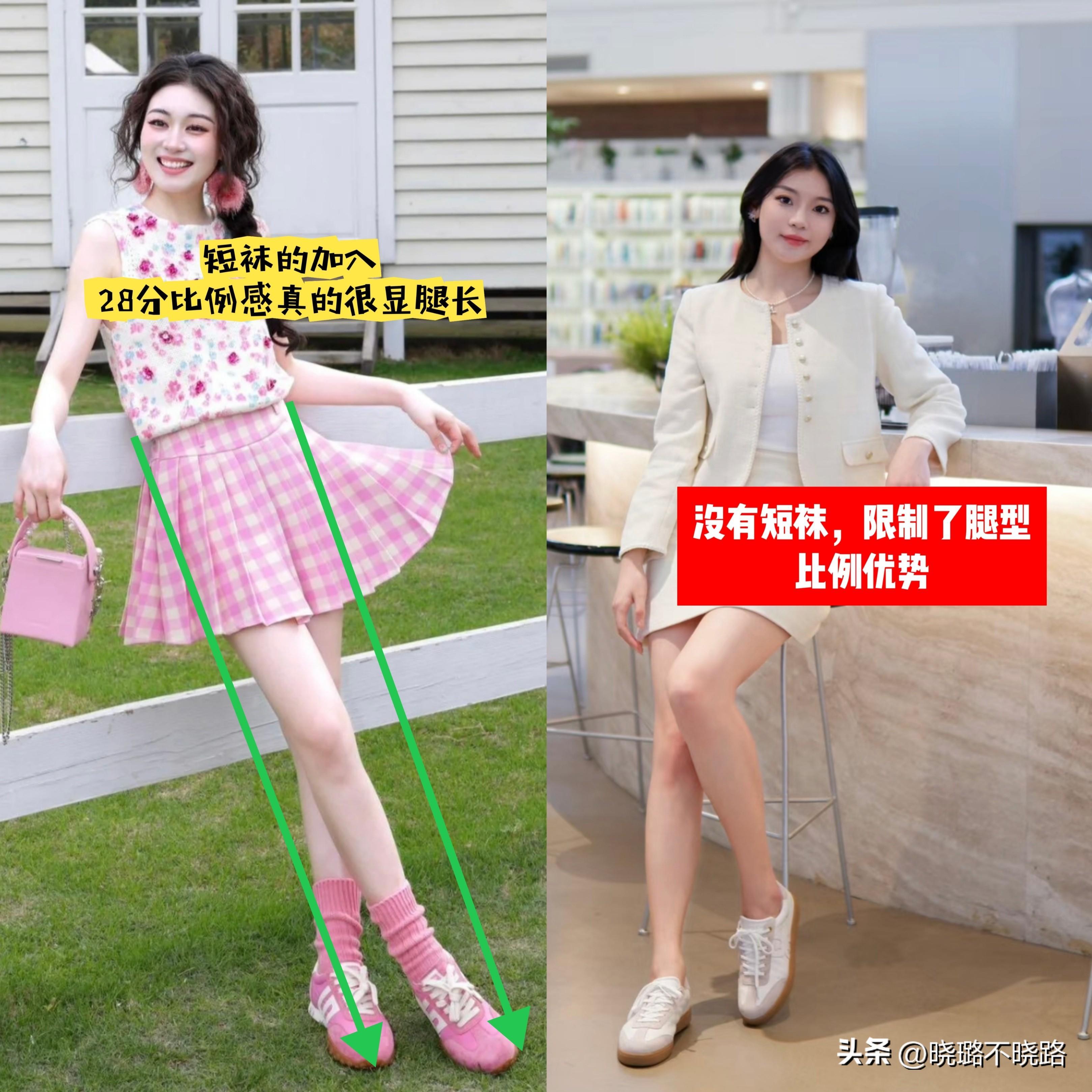 大家在選擇短款的裙裝進行搭配的時候,也建議各位可以加入2分長的短襪與德訓鞋結合起來,整個下半身的狀態,既能夠彰顯腿部的纖細感以及絕對的視覺優勢,最重要的是這樣的比例被完美的分割成了二8分狀態,所以從我們的視覺感上出發整個身材的重點就是很直觀的拉長腿型的縱向比例。