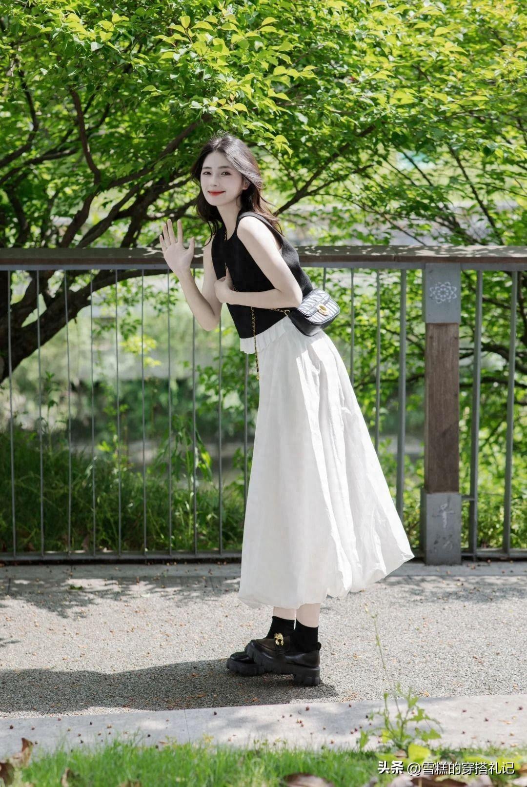 #黑色背心+淺色“及踝裙”# 一件黑色的修身背心看起來平平無奇,實際上搭配上淺色的“及踝裙”,瞬間就能創造出別樣的混搭魅力。