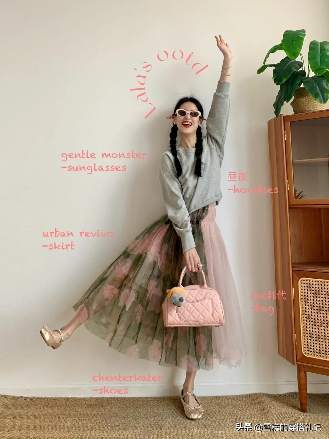 #短款長袖+印花網紗“及踝裙”# 一件灰色的短款長袖衫,下半身搭配印花的網紗及踝裙,上下拼湊出反差,整個人看起來既帶有慵懶和休閒味道,又不失甜美可愛的公主感。