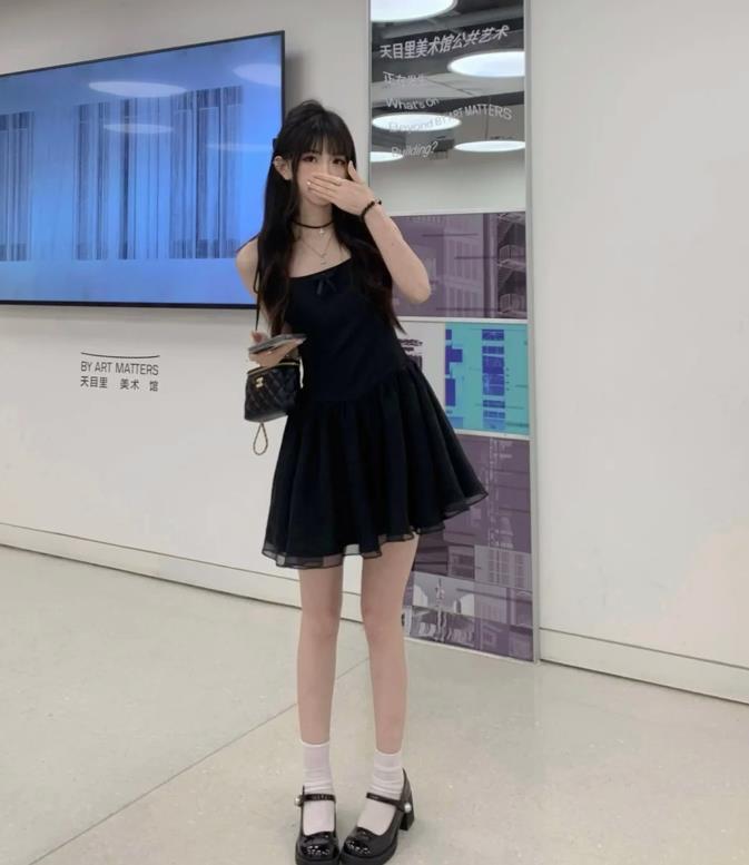 好好看的一條短款小黑裙啊,腿部比例好的姐妹們,就可以大膽穿起來哦,小吊帶的設計,可顯清爽和涼快了。利用白色襪子外露出來,製造出層次感,黑色粗跟瑪麗珍單鞋,讓你看起來更乖巧可人。