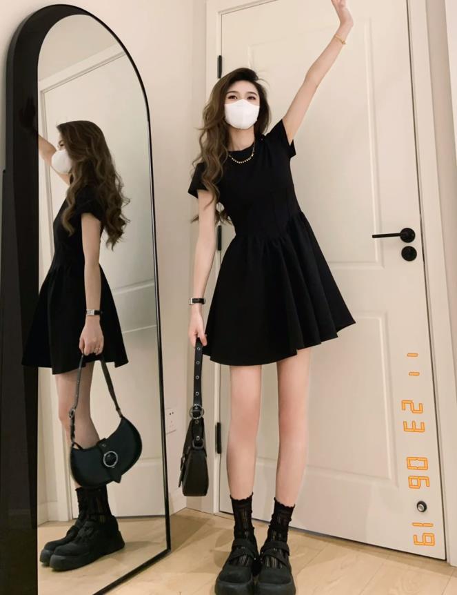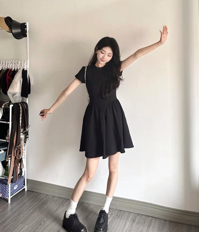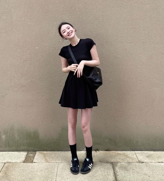 入夏又怎能少得了小黑裙呢?不要覺得這個色調在夏天裏穿就會顯得很悶熱,只要你適當露出一些腿部肌膚,照樣可以穿得很清爽涼快。這一條黑色短款小黑裙,小個子女生穿很合適,腳上穿着的襪子,和裙子進行了呼應,讓你整個着裝更和諧了。