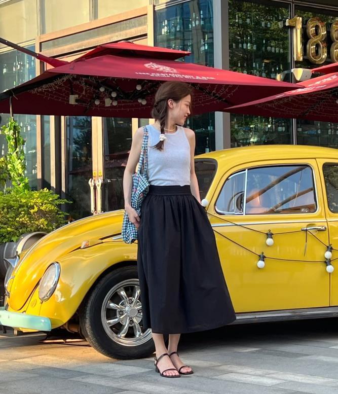 小黑裙就是與生俱來的優雅,休閒款式的黑色半身長裙,穿得舒適自在又非常顯瘦,裙子長度選擇在小腿左右位置,這樣既可以遮掩起身上的贅肉,又顯瘦,搭配一件背心後,就很清爽涼快了。