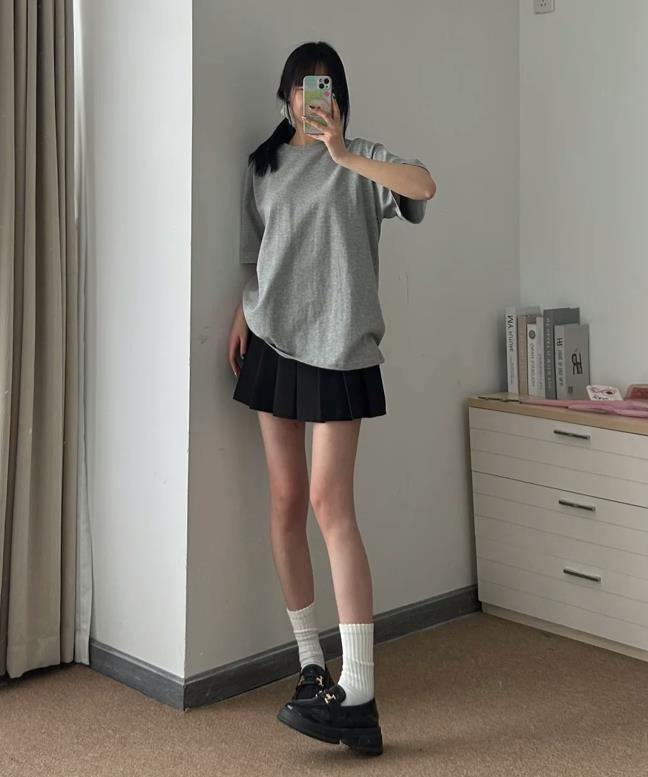 黑色系的單品真的很百搭啊,黑色百褶半身短裙,可以打造你想要的青春與活力,上衣選擇一件灰色短袖t恤,黑白配,也太時髦耐看了。腳上穿上一雙黑色樂福鞋,再利用一雙白色襪子外露出來,很好增加了造型的層次感。