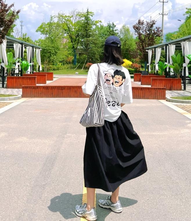 T恤配裙子的穿法,是真的很適合夏天呢,這一套懶人穿搭,姐妹們可以借鑑起來,黑+白的配色,就是很時髦耐看。選擇一雙運動鞋來配,輕鬆就能穿出休閒與自在,可以增加一頂棒球帽,既防曬又豐富了整個造型。