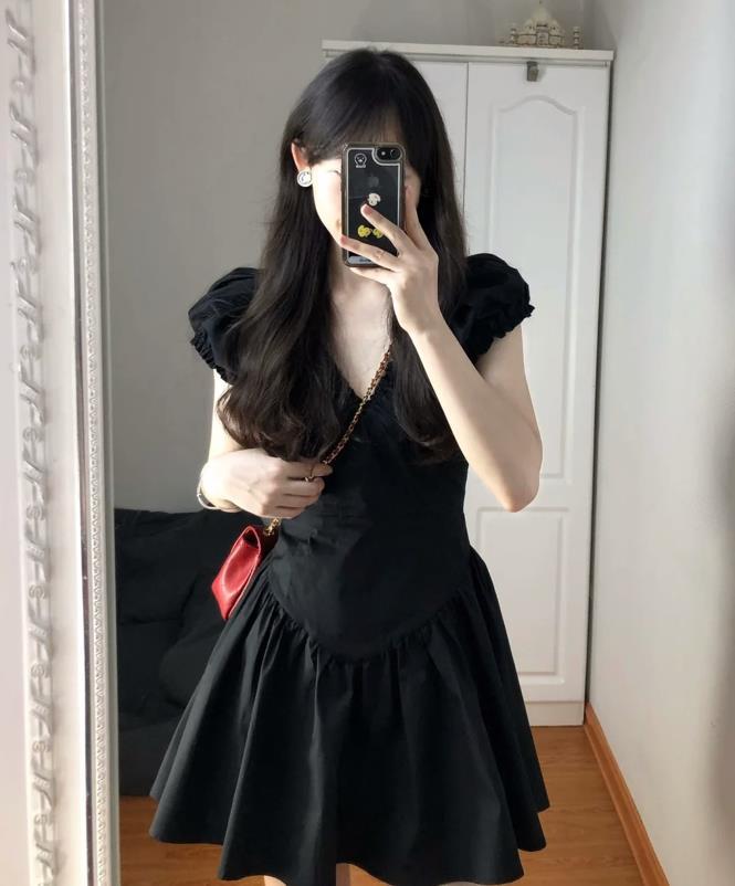 小黑裙穿起來真的非常顯瘦呢,上身比例不夠完美的,可以選擇這種v領設計的款式,既能修飾你的上身比例,又能拉長下身的身形。