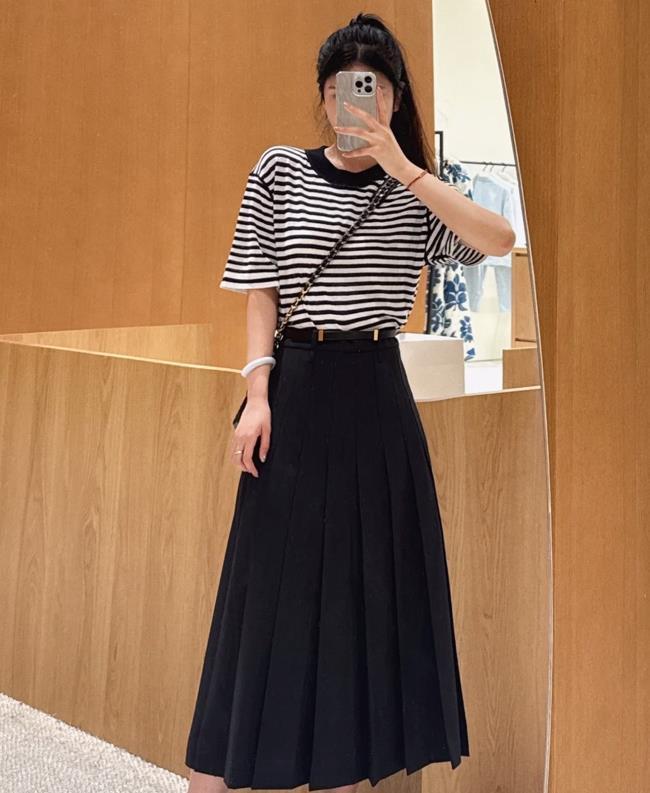 條紋短袖t恤+黑色百褶半身長裙,一簡一繁的組合,真的很好看啊,最重要的是這麼穿還非常減齡,不管是上班通勤,還是逛街約會都ok。