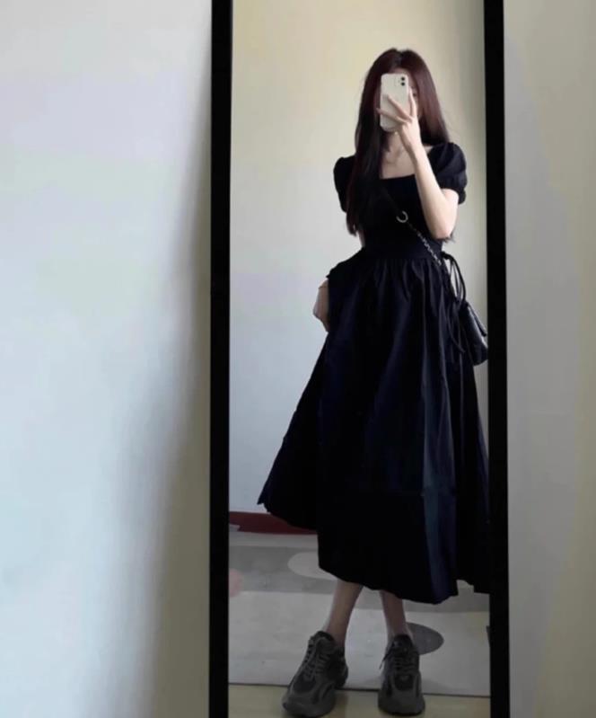 很顯高級的一條黑色長款裙子,方領的設計+泡泡袖,既不失甜美又很減齡,裙身版型選擇傘字形狀,或者是a字形的,對於梨形身材和胯寬的姐妹都很友好。搭配起一雙運動鞋,真的既休閒舒適又好看。