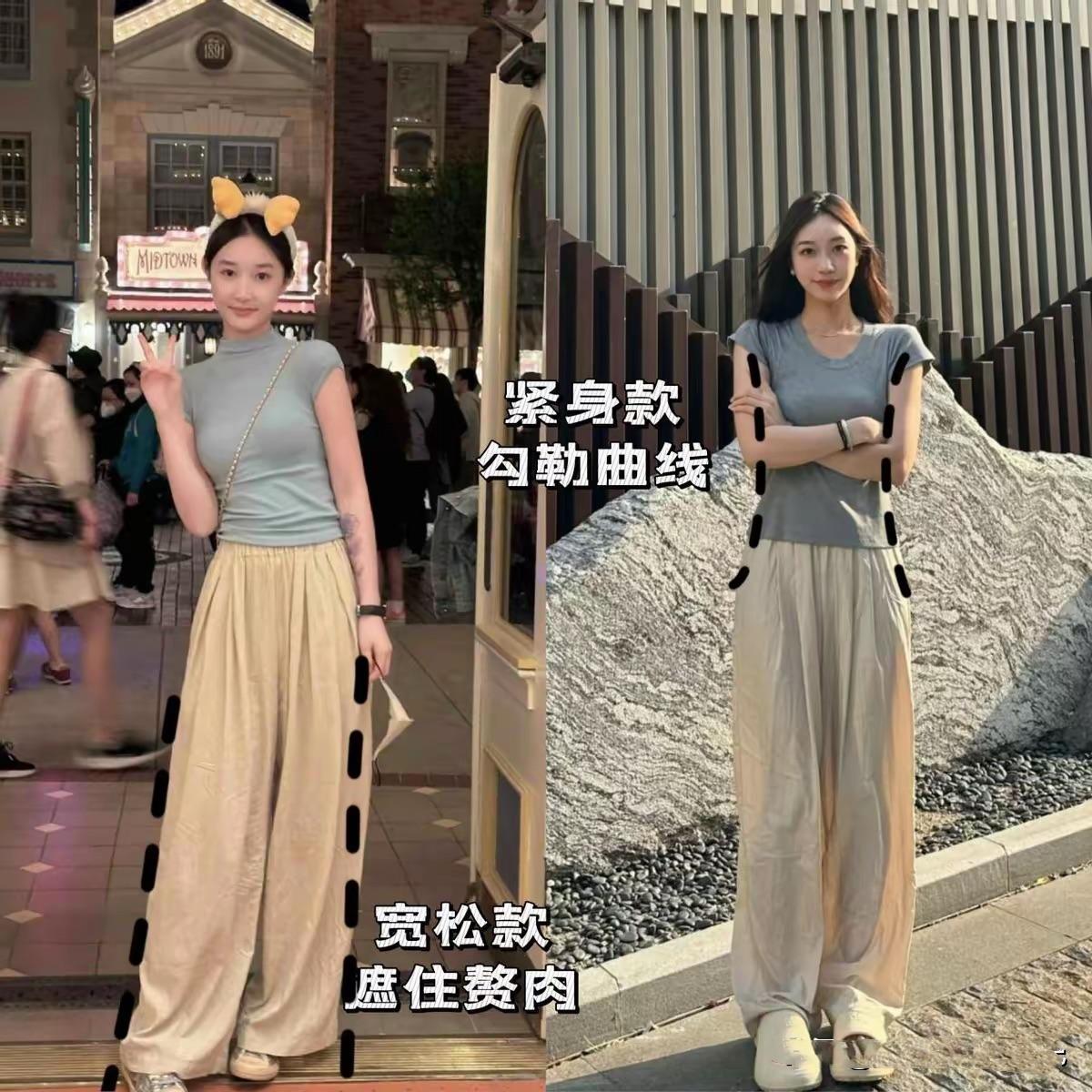 緊身的T恤搭配寬鬆的山本褲,就可以勾勒出上半身的曲線美。如果上身曲線比較完美,自然可以嘗試緊身T恤+山本褲的組合。