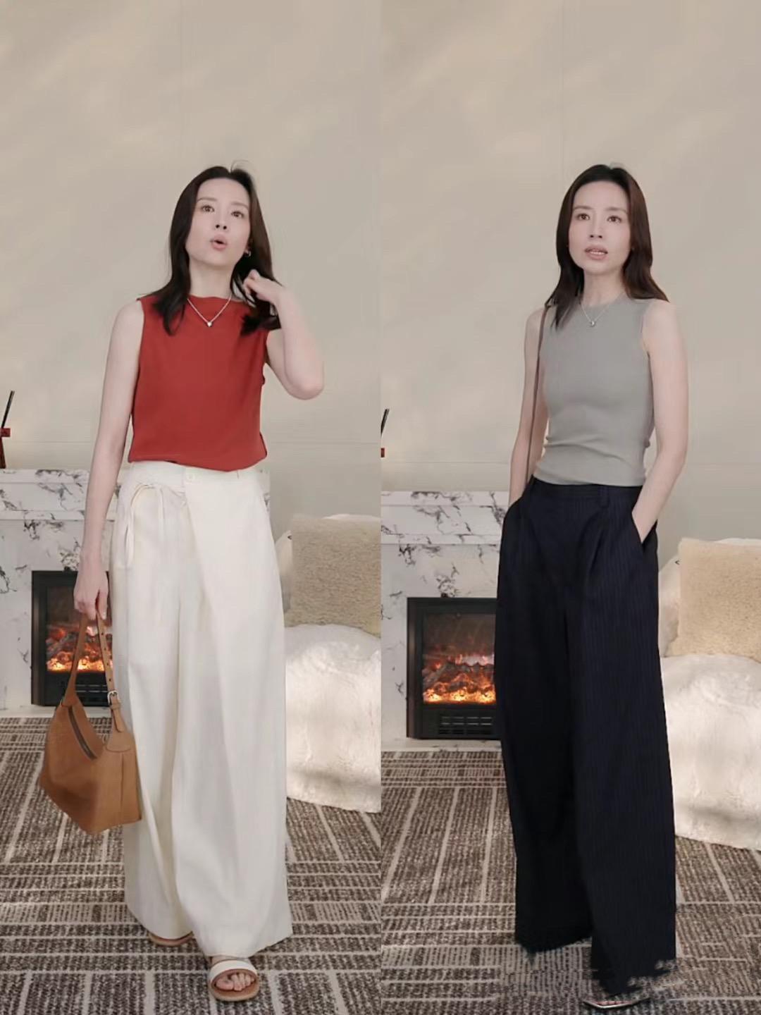 無袖的小背心,可以搭配高腰的西裝闊腿褲,簡簡單單的就很洋氣。無袖背心配上高腰的西裝闊腿褲,上緊下松的搭配、現代比例感更加優越。