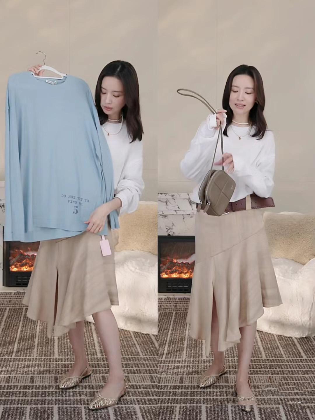 寬鬆襯衫+白色半身裙的穿搭,可甜美可俏皮,也值得大家借鑑。其實40+的年紀,想要少女範一點都不難。