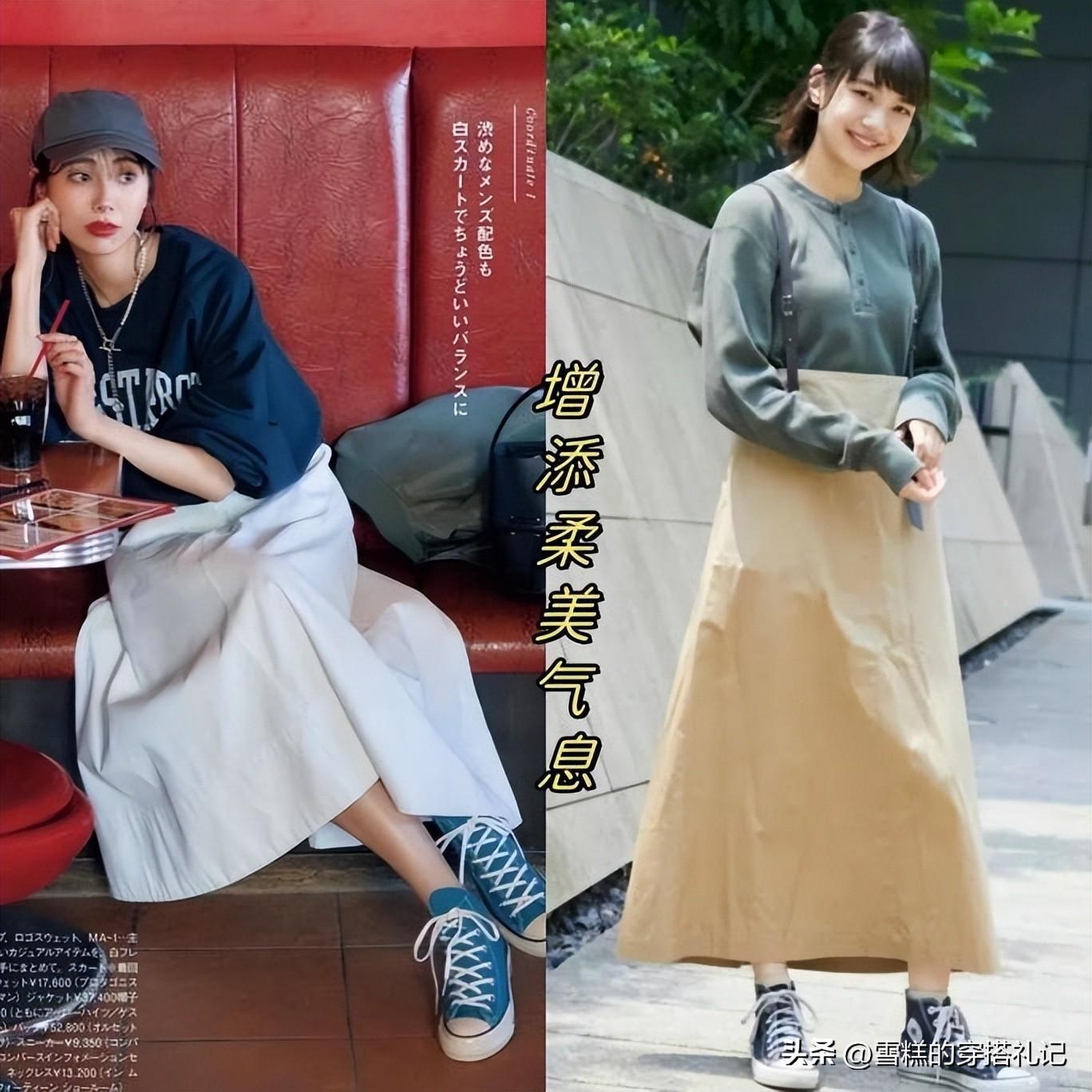 裙裝可以增加造型的魅力,顯得更有女人味。選擇短裙或者是露出腳踝的長裙,與帆布鞋搭配能營造出輕鬆自在的感覺,同時又帶着俏皮與可愛。