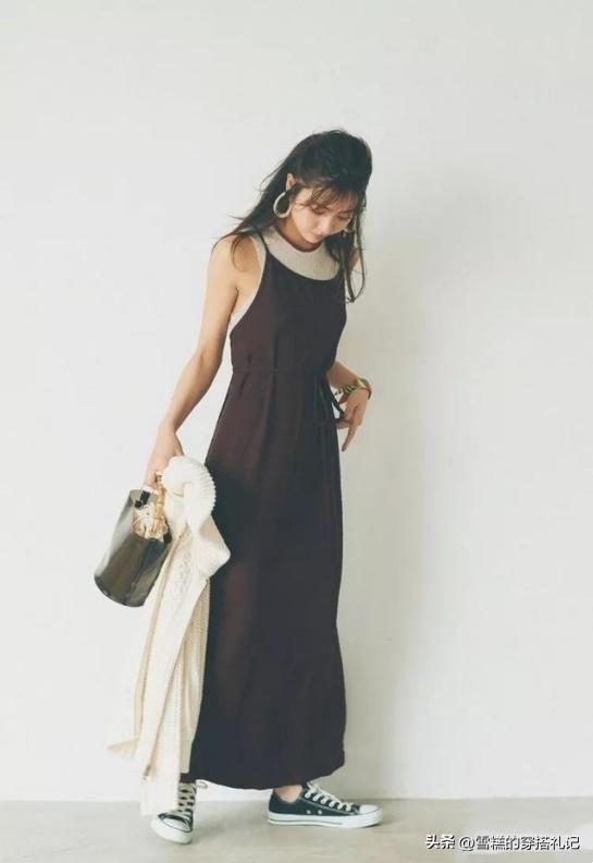 >示例3、背心疊穿吊帶長裙+黑色帆布鞋