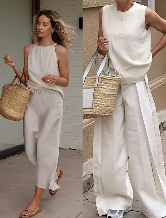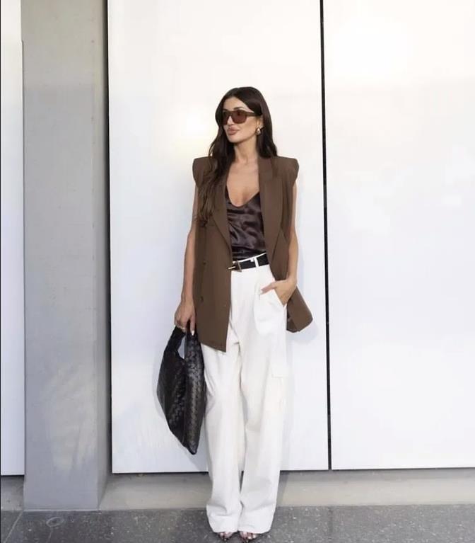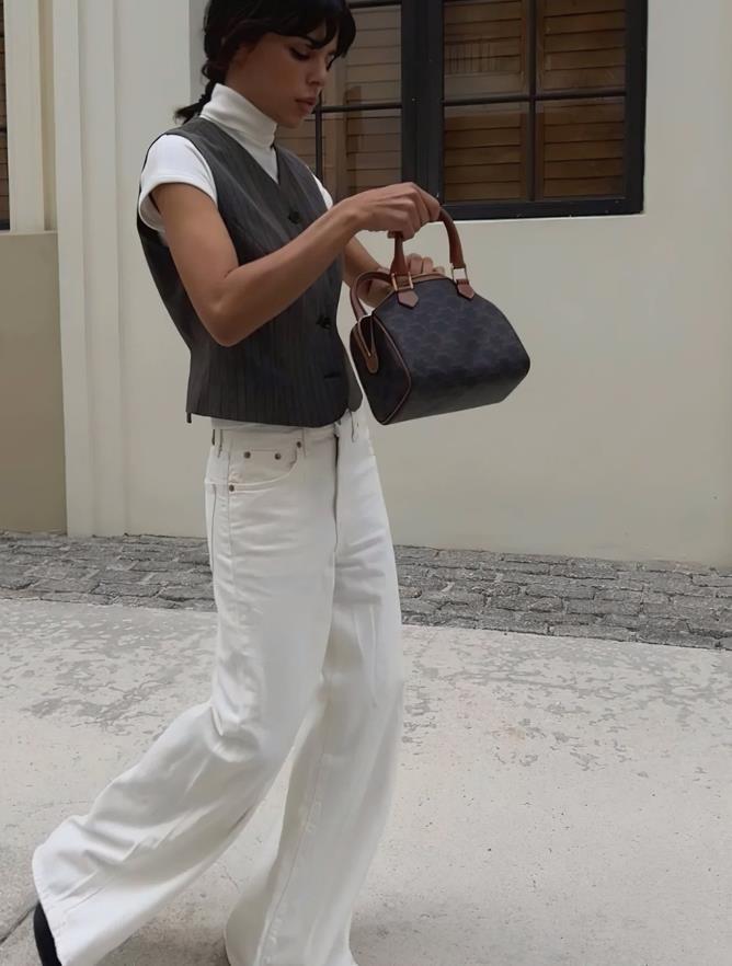 當然,你也可以進行疊穿,馬甲+短袖,這種疊穿方式可是比較常見的,配色上只要遵循深淺結合即可。搭配白色的闊腿長褲,誰敢說這種褲裝穿起來顯胖呢?只會顯得更舒適自在和顯瘦。