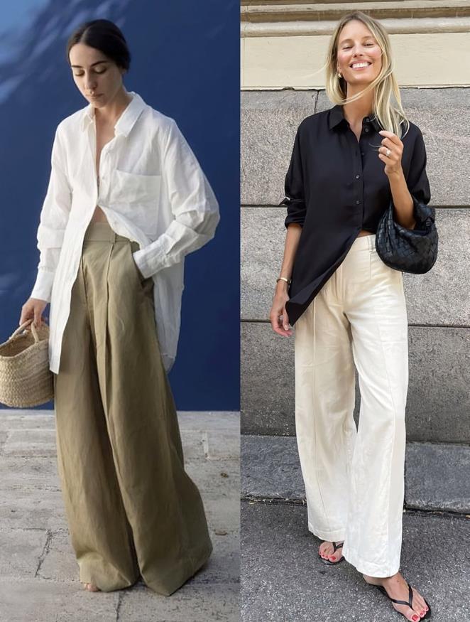 藏藍色的襯衫+同色系闊腿褲,對於懶人來說,這樣的套裝出門可省心了,完全不用擔心會出錯的,只需簡單穿上一雙涼鞋就可以,記得要佩戴一些飾品,有助於提升造型的精緻和時髦。