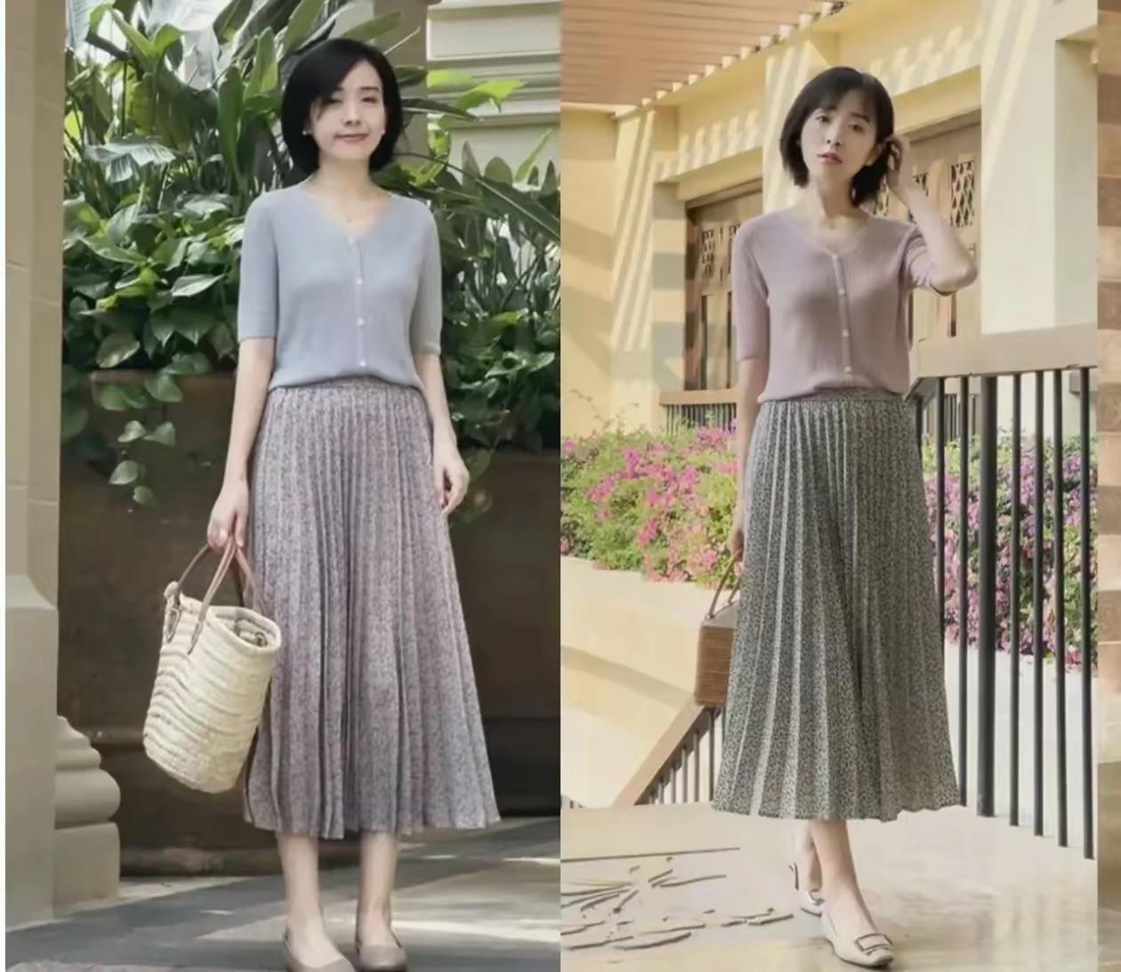 高腰的百褶半身裙,雙層薄紗的修飾、浪漫且溫婉。用百褶半身裙、來搭配帶有微彈效果的冰絲T恤,更多了幾分溫柔雅緻。