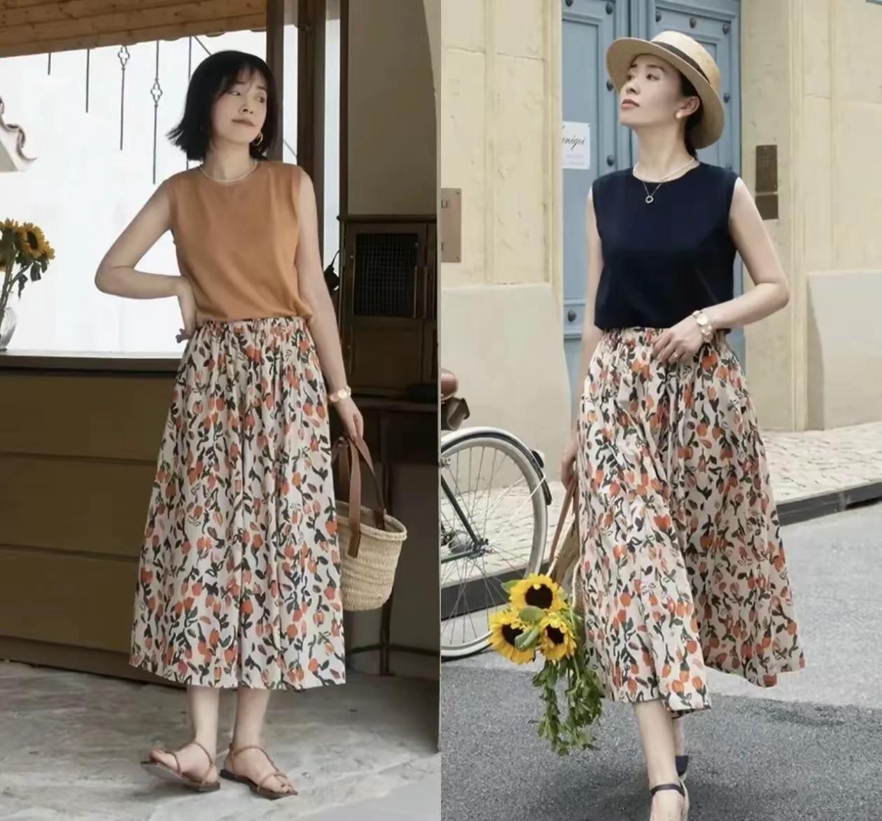 用印花半身裙,搭配無袖的T恤,夏日穿搭更加清爽。這種帶有微彈效果的無袖T恤,可以配高腰的印花半身裙來穿着,看似簡單的搭配、也不會顯得乏味。