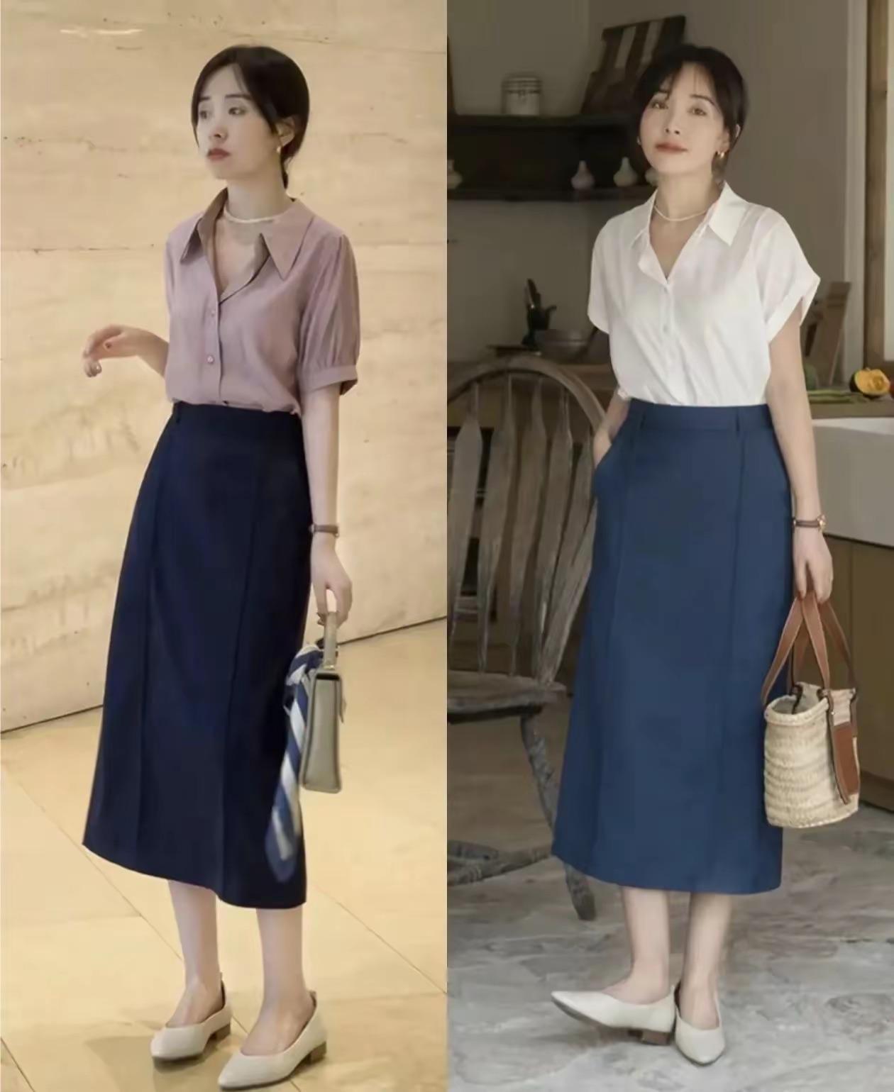 不管是T恤、還是襯衫,在夏天都可以配半身裙來穿着。小飛袖、或者落肩袖的襯衫,配上直筒半身裙,具備了優雅女性的端莊。