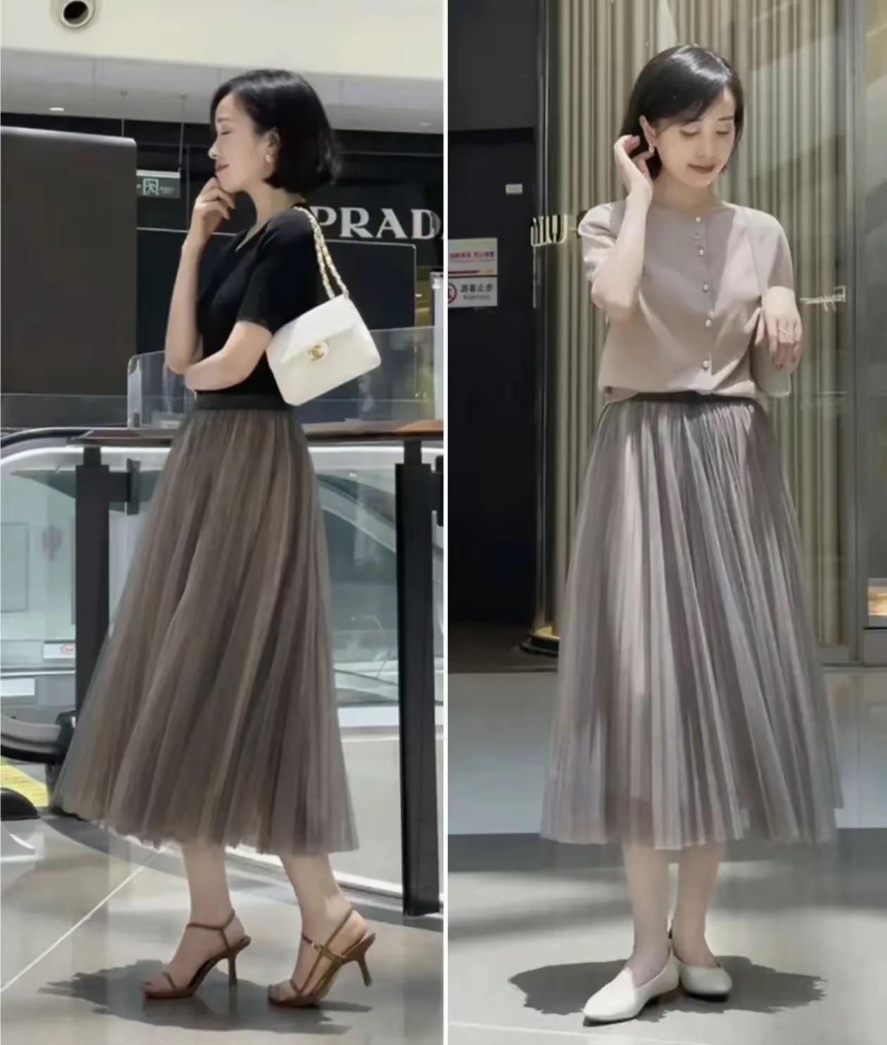 百褶的半身裙,以輕柔的薄紗爲質地,裝點出成熟女人最浪漫的美。像這種輕薄的百褶半身裙,搭配基礎款T恤也很優雅。