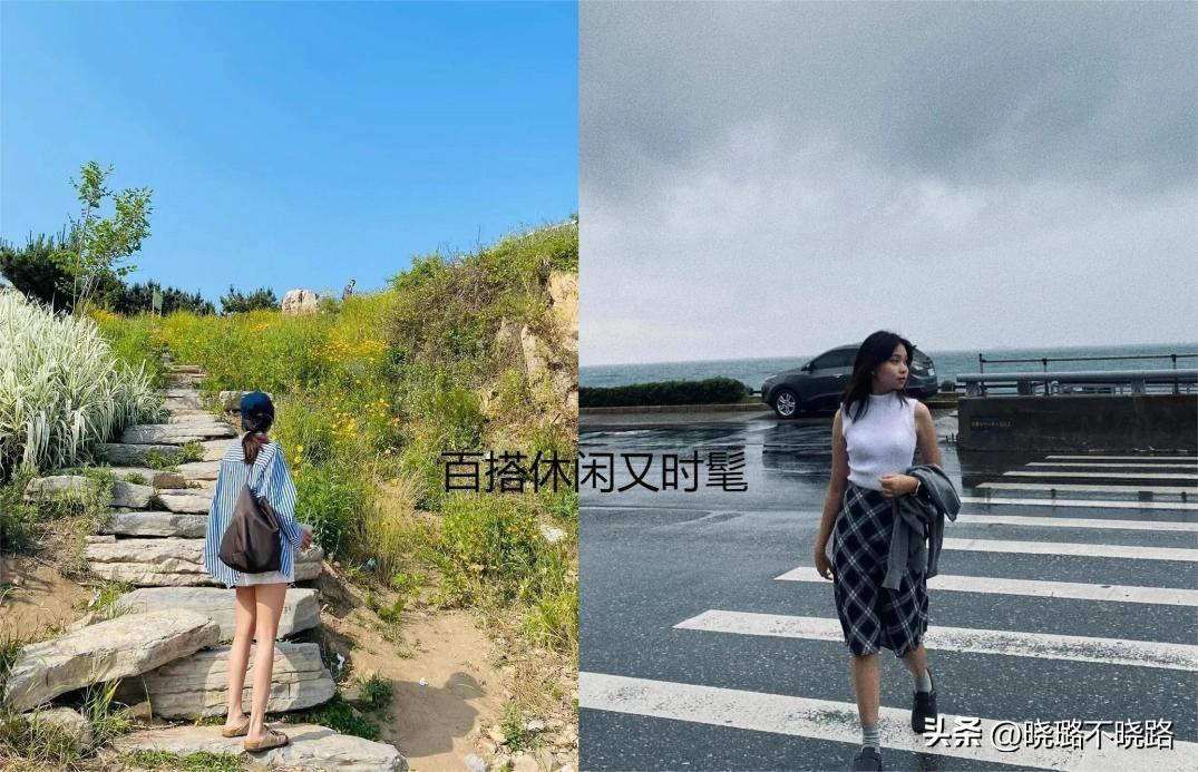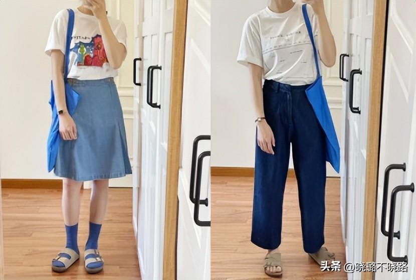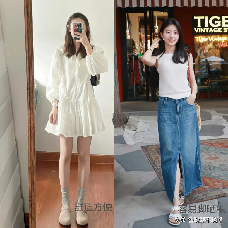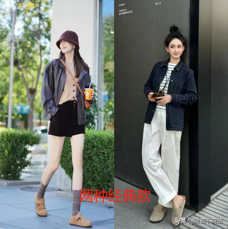 半拖款式的鞋子我們也穿過,但是相較於那些尖嘴款式的設計,勃肯鞋圓頭圓腦的前半部分輪廓走向,給腳掌偏寬或者腳背偏厚的女生提供了很足的傳達空間,而且視覺上看起來線條感很弱,所以也是偏向減齡的可愛風格,在穿衣設計的時候,我們就可以有意識的去向減齡的部分靠近。