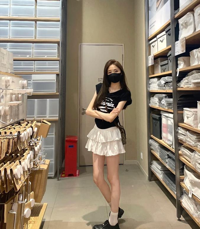 黑白配實在是太耐看了,完全不挑人穿的配色,黑色短款t恤+白色半身短裙,這樣的小短裙,對於個矮的女生就是非常友好,輕鬆打造出高挑感。白色襪子進行點綴,不僅與裙子顏色進行了呼應,還讓整個造型更協調了。