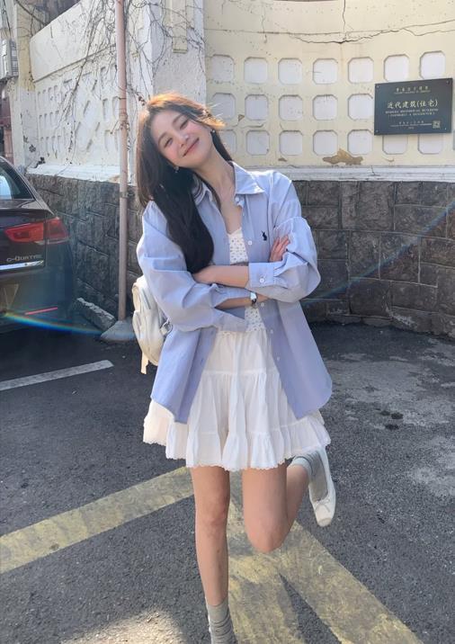 這樣一套看起來真的好韓哦,有種清純小白花的既視感,既不失韓系範,又頗顯少女感,小碎花背心+白色半身短裙,外面隨便配一件襯衫,清爽防曬又好看。