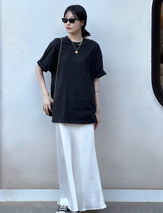 喜歡鬆弛感穿搭的姐妹,就一定要試試這套,黑色寬鬆t恤+白色緞面半身長裙,鬆弛感的組合,實在是太不挑人了,對身材有着極佳的包容性,也顯瘦。適當佩戴一條項鍊進行點綴,可以爲整個造型加分不少,也不失精緻。