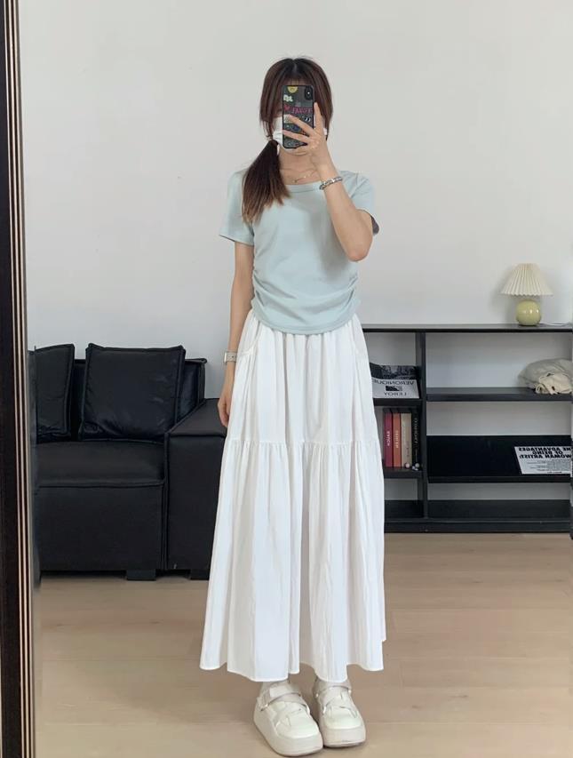 真的很喜歡小白裙,完全就沒法拒絕呢,這麼一條白色半身長裙,可以很好遮掩住腿粗或者是胯寬的缺點,顯瘦的同時又藏肉。與淺色的短袖t恤相配,一短一長的組合,不僅優化了整個身材比例,還顯高挑。