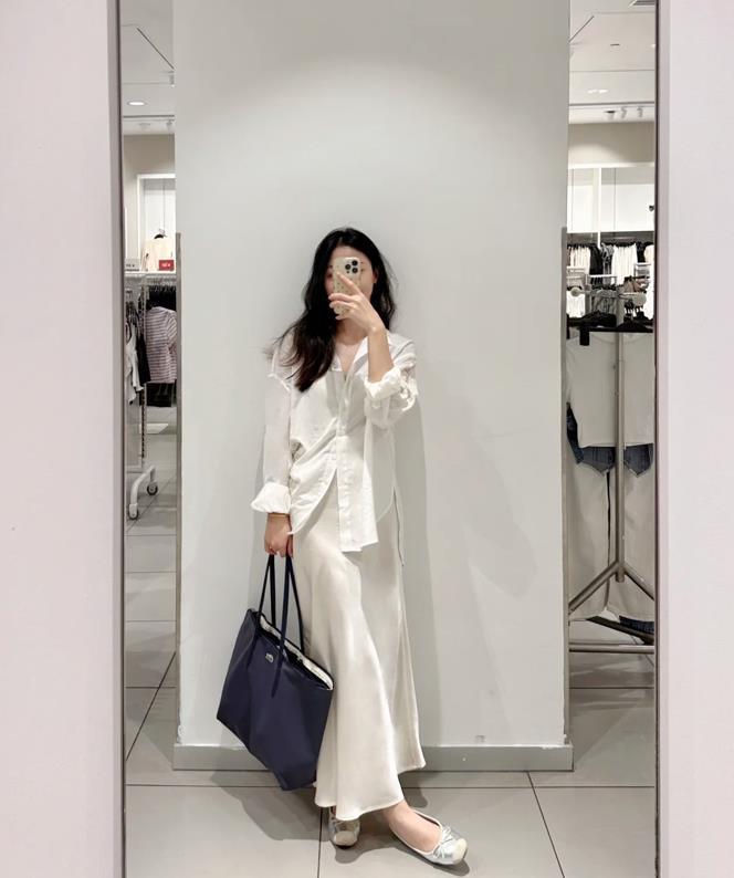 一身乾淨的白色穿搭,看起來也太溫柔了,基礎款的白色襯衫,搭配同色的緞面半身長裙,寬鬆的組合,將鬆弛感完美呈現出來。不管是上班通勤,還是逛街約會,都可以輕鬆駕馭。