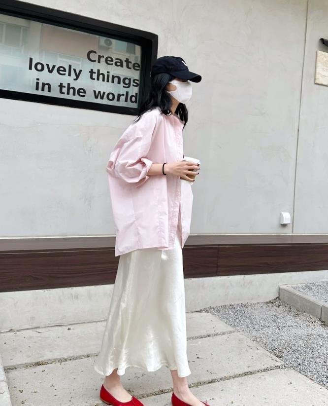 淡淡粉色的襯衫,真的比白襯衫好看太多了,喜歡這種低飽和度的配色,很襯膚色和顯白,黃黑皮都可以輕鬆駕馭。選擇一條白色緞面半身裙相配,一整個高級,也很不失溫柔。
