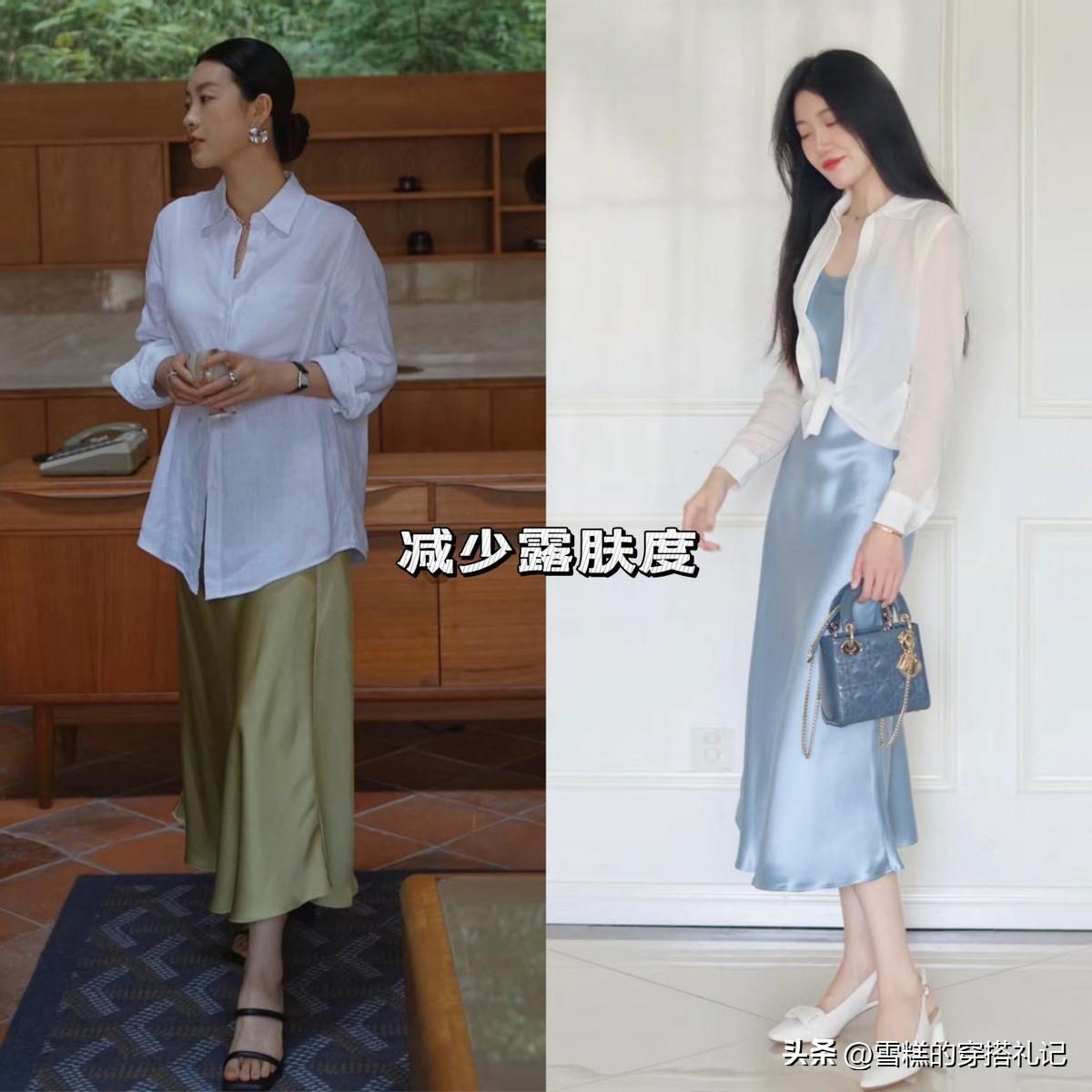 當醋酸裙遇上襯衫,便可以降低造型的露膚度,從而避開俗氣廉價的現象。這組穿法也非常百變,我們可以針對身材類型,去選擇與之匹配的搭配方式。