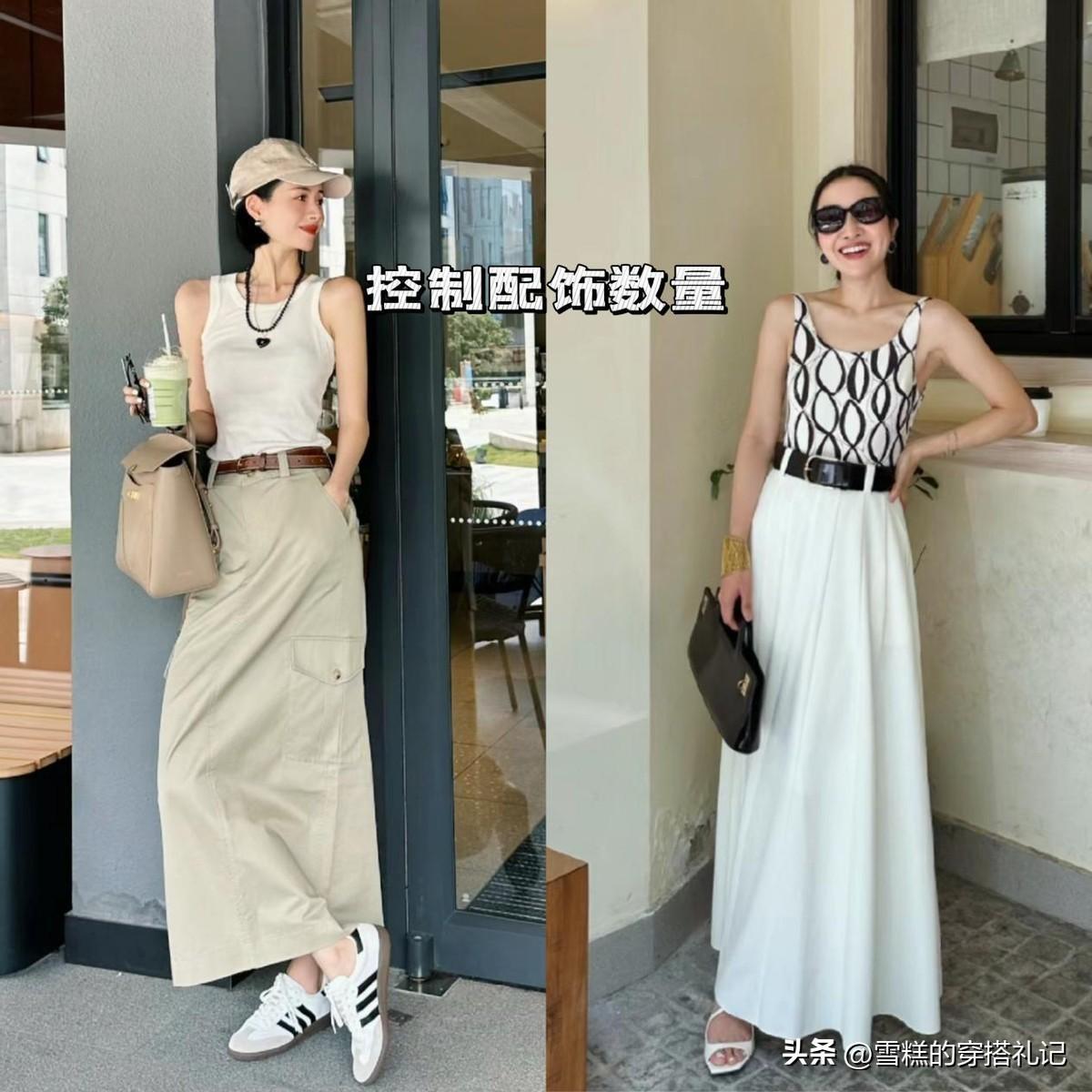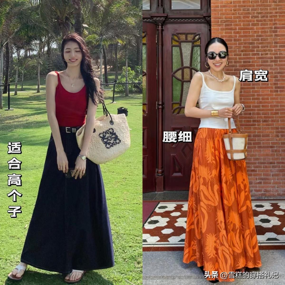 梨型身材:背心和及踝裙的搭配,多數都是上窄下寬的穿法,所以針對臀肥、胯寬、下身臃腫的姐妹,是完全沒有難度的。