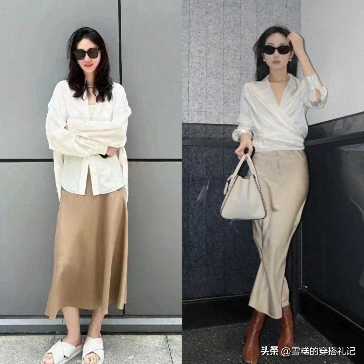 相比起絲綢裙,醋酸面料的裙子性價比更高,更符合普通女人的穿衣需求。而且,自帶光澤感的醋酸裙,穿在身上比闊腿褲更高級有檔次,垂墜感十足的面料,配合上過膝的長度,在視覺上很有延伸性。