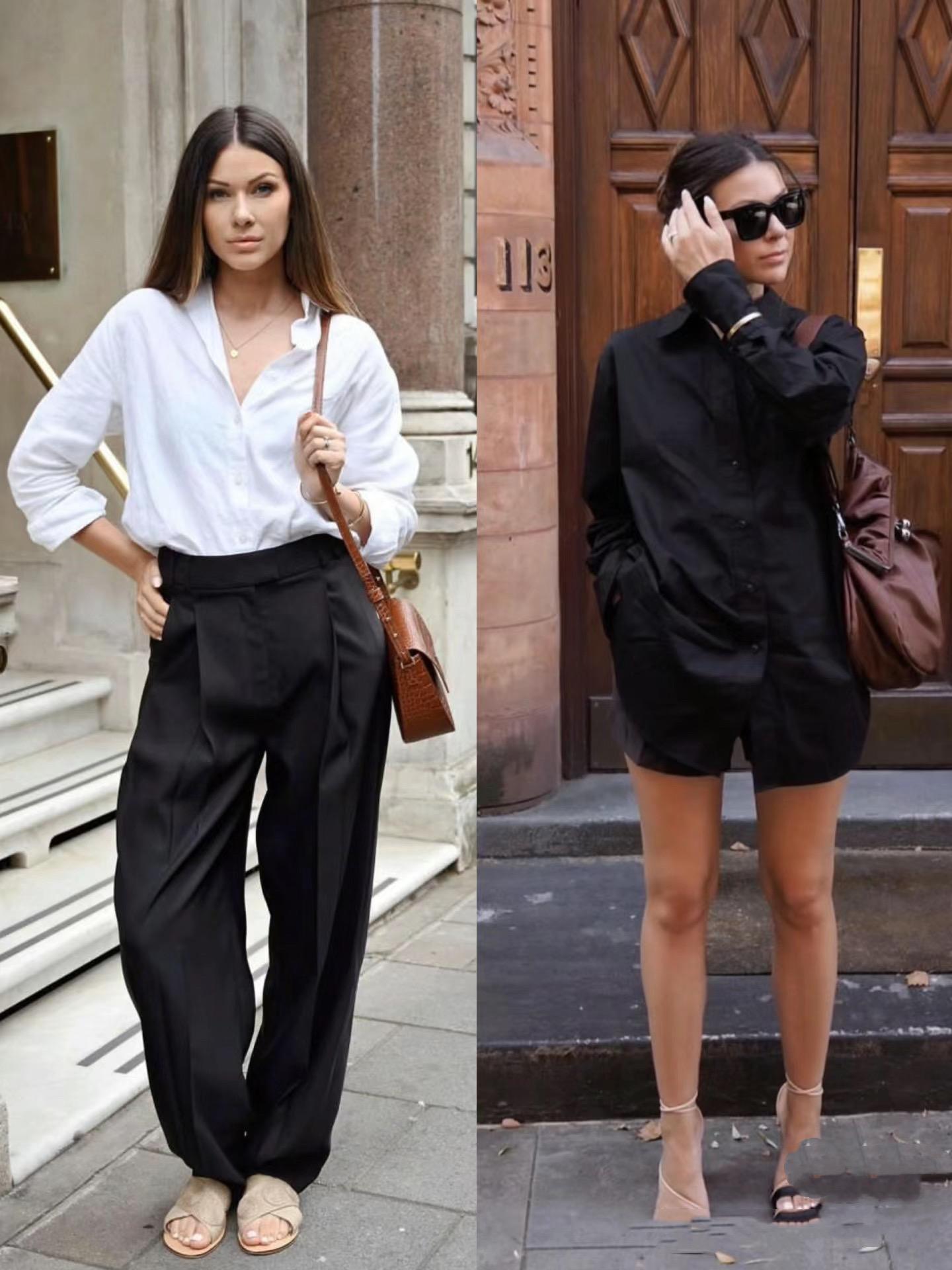 簡簡單單的白襯衫,可以搭配西裝褲來穿着。經典的黑白配,利落高級又不挑人。像這種寬鬆的白色襯衫,配寬鬆的西裝闊腿褲有一種隨性鬆弛的美。