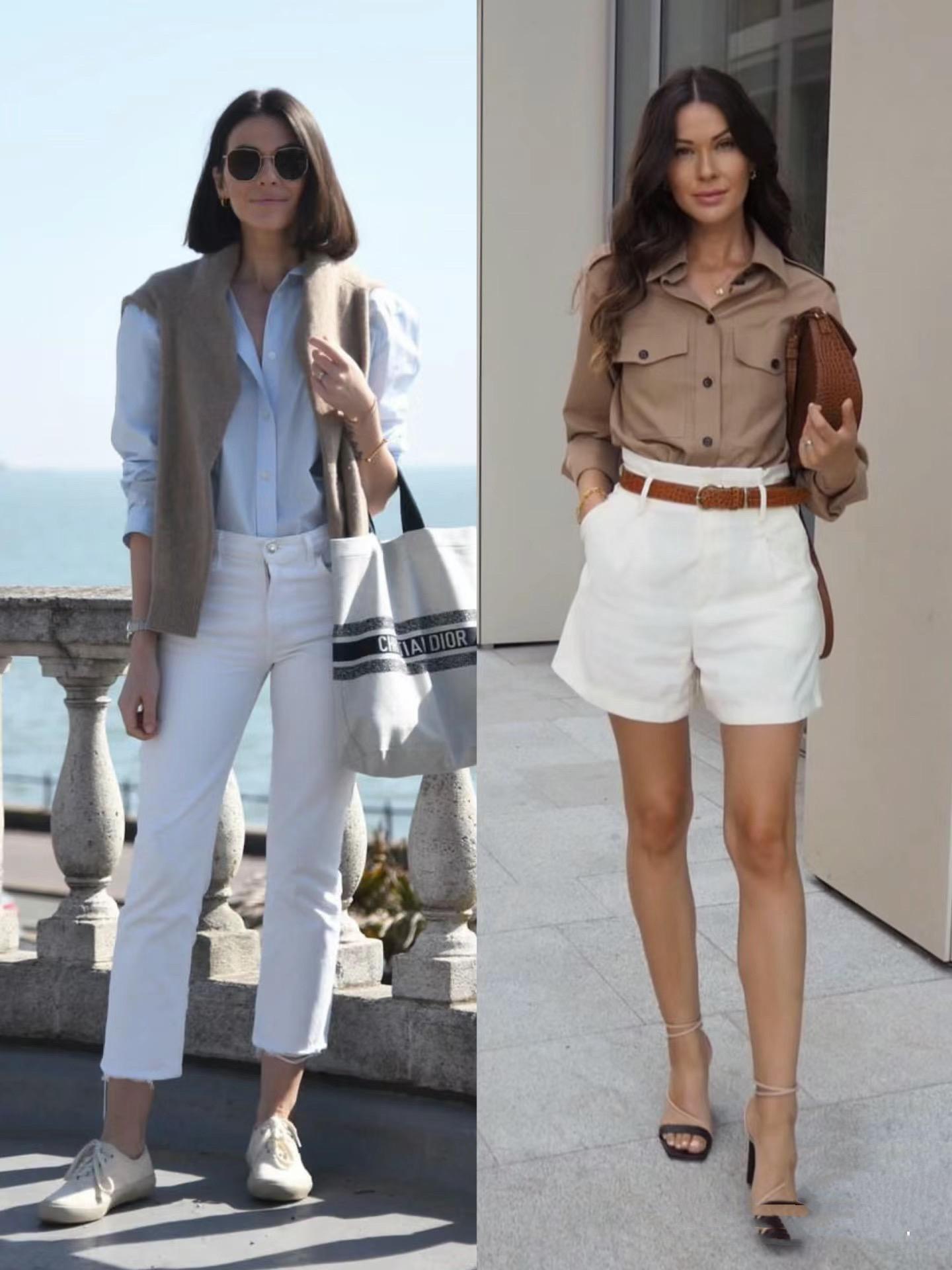 稍微寬鬆的淺藍色襯衫,可以配適當修身的白色直筒褲。白色直筒褲以比較修身的剪裁,顯得雙腿線條更加筆直。白色直筒褲選擇九分褲型,也更爲清爽。