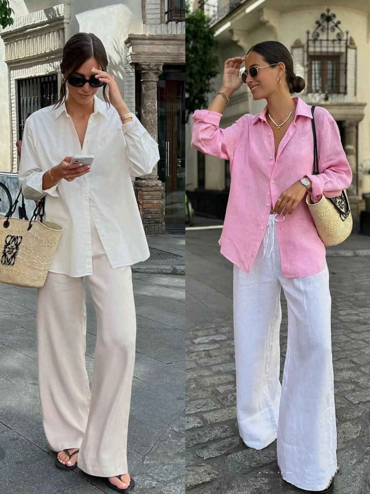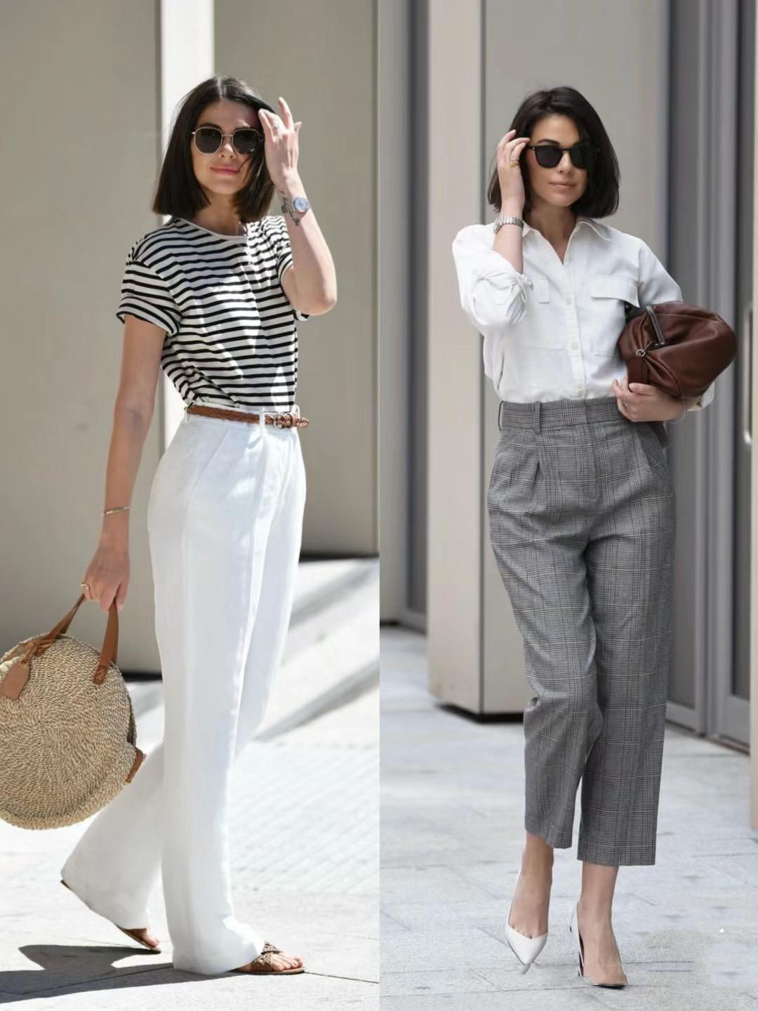 寬鬆的白襯衫,搭配V領的剪裁,剛好露出鎖骨線條、更加的精緻考究。黑色西裝闊腿褲儘量搭配輕薄面料,夏天穿起來大氣又不悶熱,西裝闊腿褲業很容易搭配。