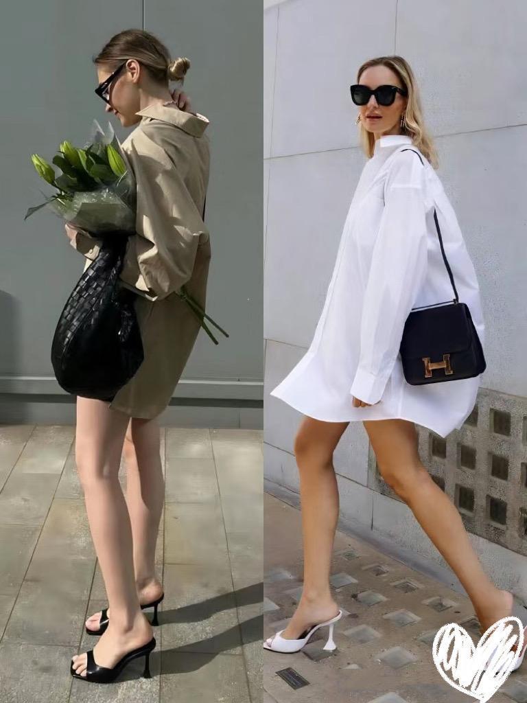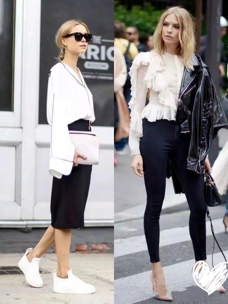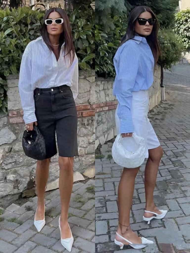 白襯衫、黑色短褲/半身裙,也是一種常見的組合方式。尤其是夏天裏的白襯衫,我們可以選擇帶有獨特心機的設計。