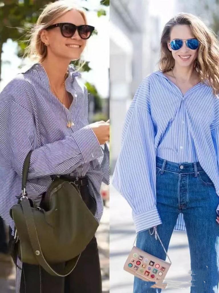 比如經典的條紋襯衫,我們可以配高腰的牛仔褲來穿着,將條紋襯衫的領口拉扯的鬆垮一點,露出鎖骨和頸部線條。巧妙的塞一個衣角,就更加時尚。