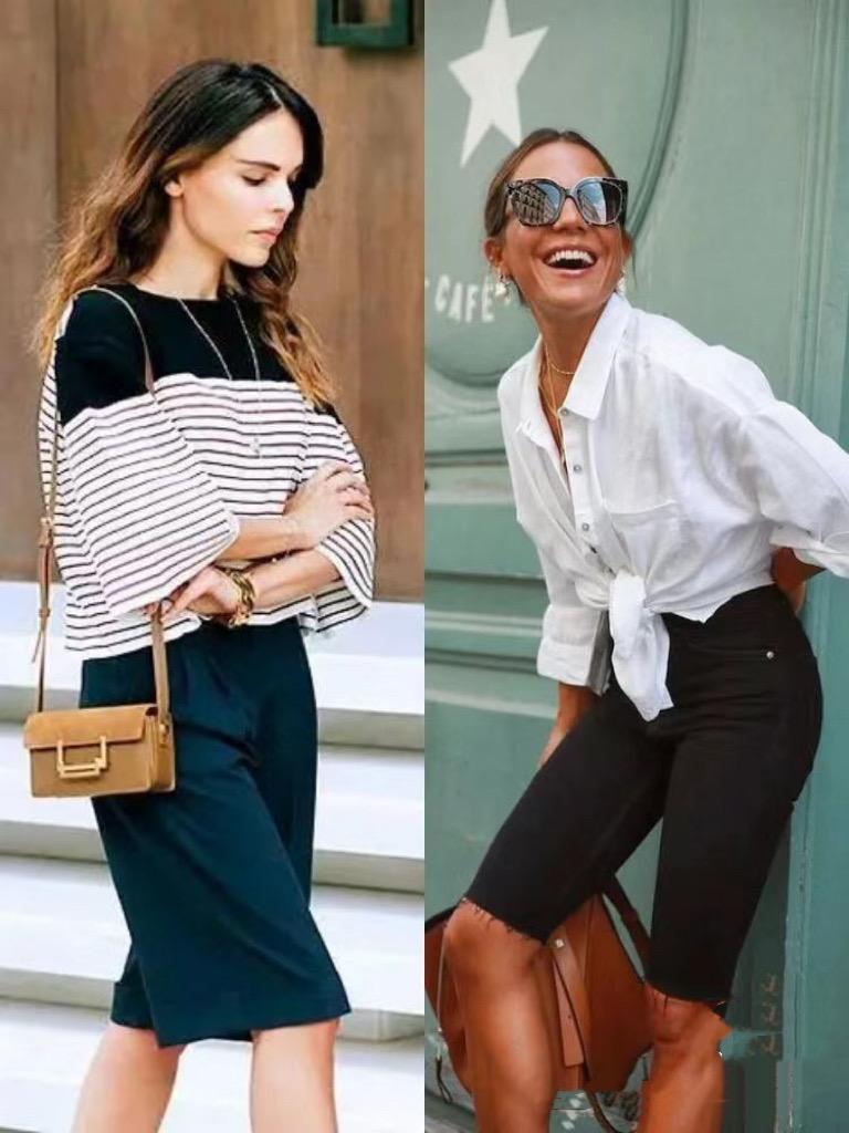 夏天裏的四分褲,可以選擇高腰的西裝短褲、或者修身一點的騎行褲。高腰的四分褲,最容易修飾身材,搭配寬鬆白襯衫、也可以顯得清爽幹練。