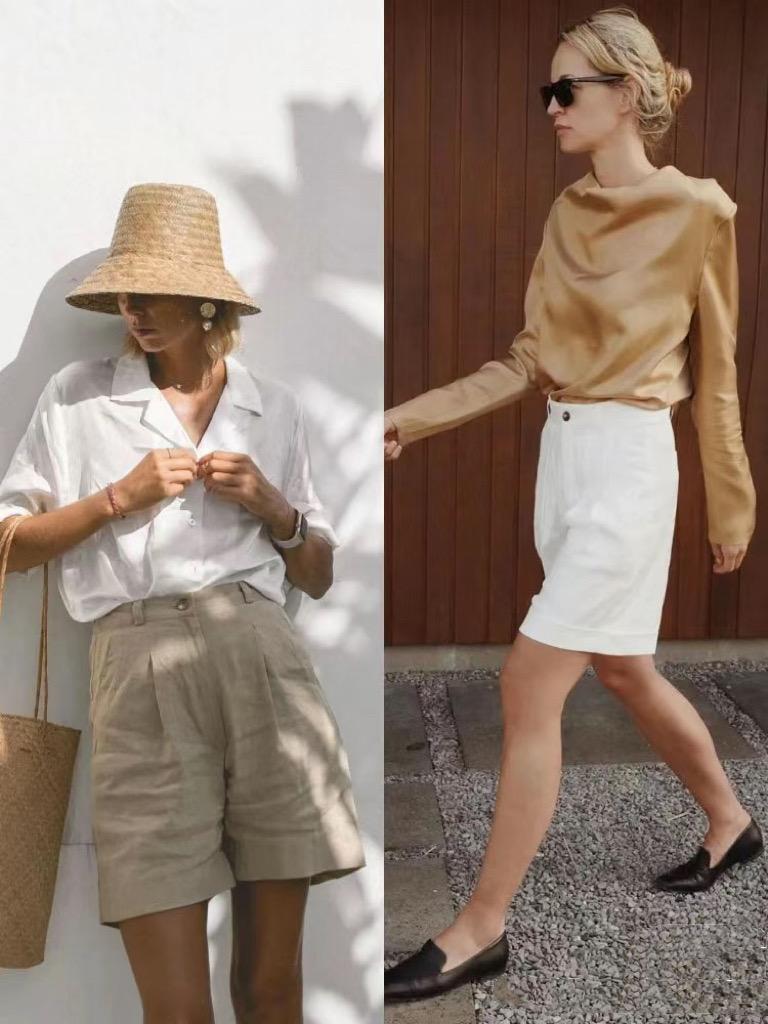 白色襯衫搭配亞麻色的四分褲,就會有一種清爽且文藝的美。亞麻短褲A字形的剪裁,抬高腰線、修飾身體比例。搭配V領剪裁的白襯衫,低調中透着精緻。