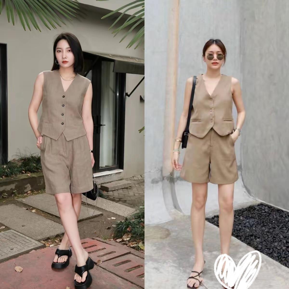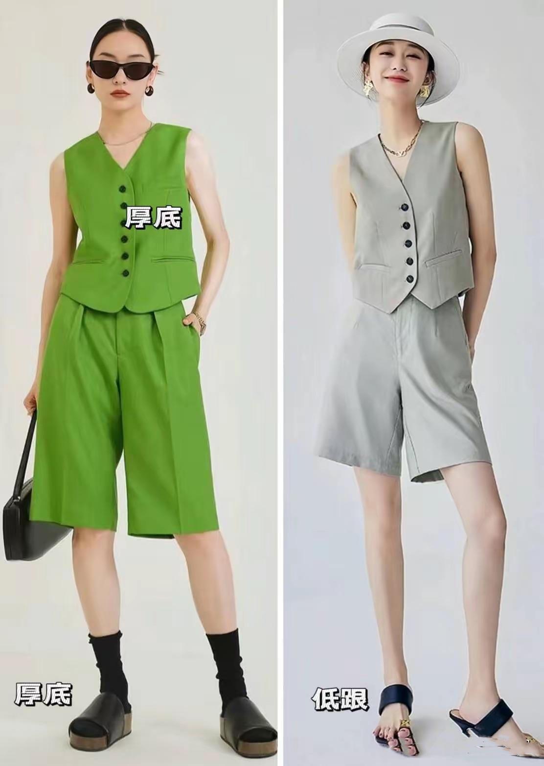 西裝馬甲+同款的百慕大中褲,可以休閒隨性、也可以高級體面。如果你個子高挑的話,自然可以搭配低跟的鞋子。