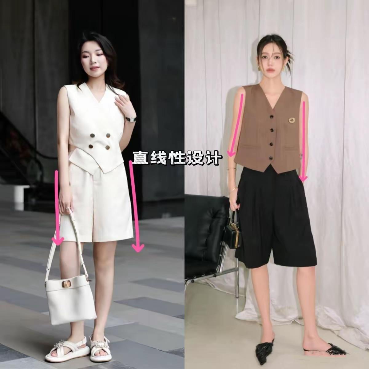 傳統的西裝馬甲,通常是疊搭襯衫來穿着。在夏天用西裝馬甲來凹造型,直接單穿便個性洋氣。線條流暢的西裝馬甲,搭配個性的剪裁,更加洋氣顯瘦。