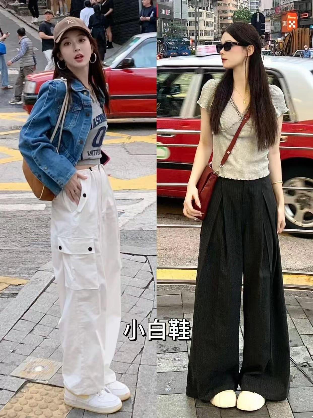 小個子女生穿闊腿褲,儘量搭配鞋底偏厚一點的小白鞋。3cm左右的小白鞋,有一種高樓平地起的感覺,不突兀、卻更加顯高。小白鞋配闊腿褲,簡直就是天生一對。
