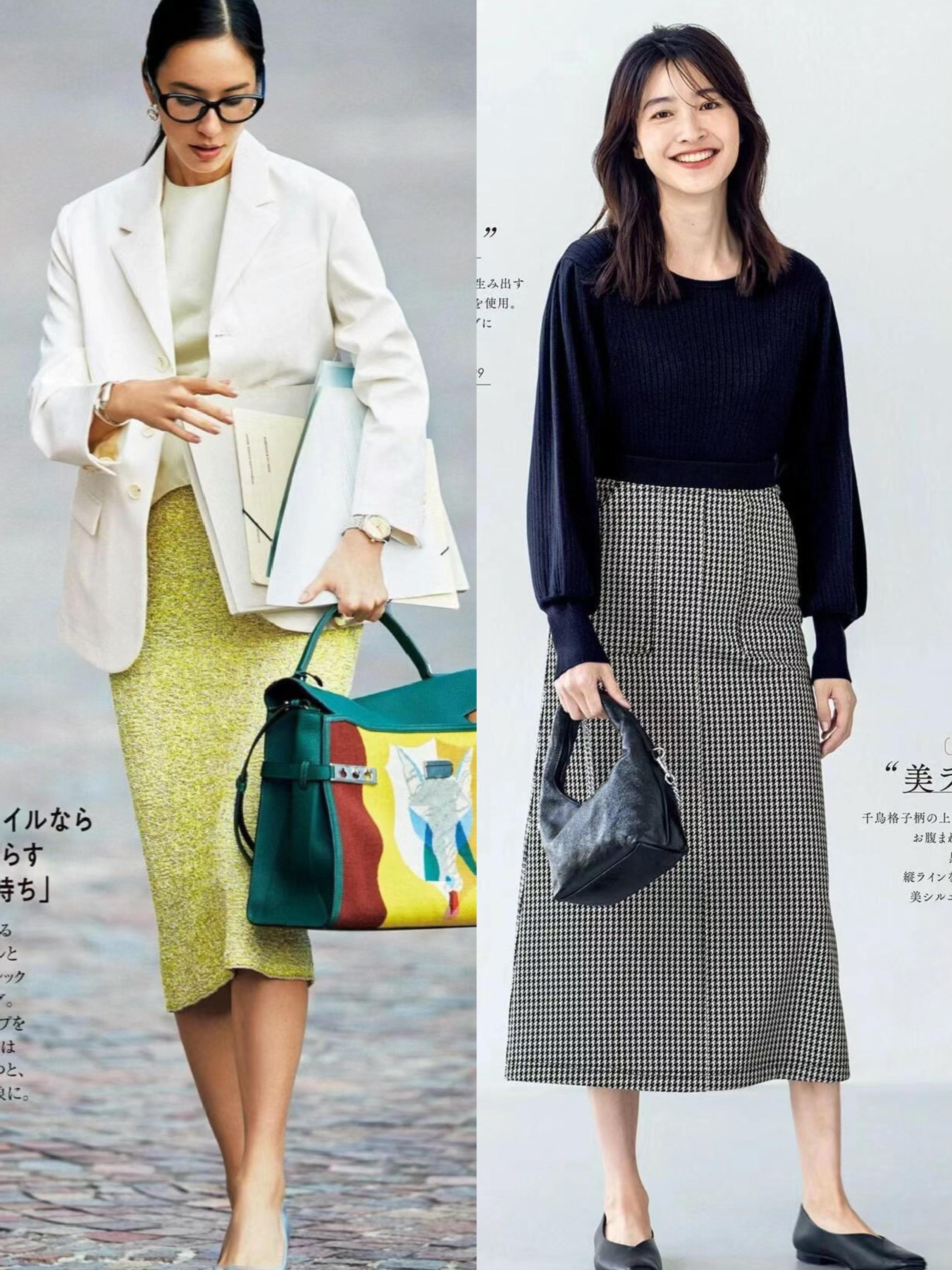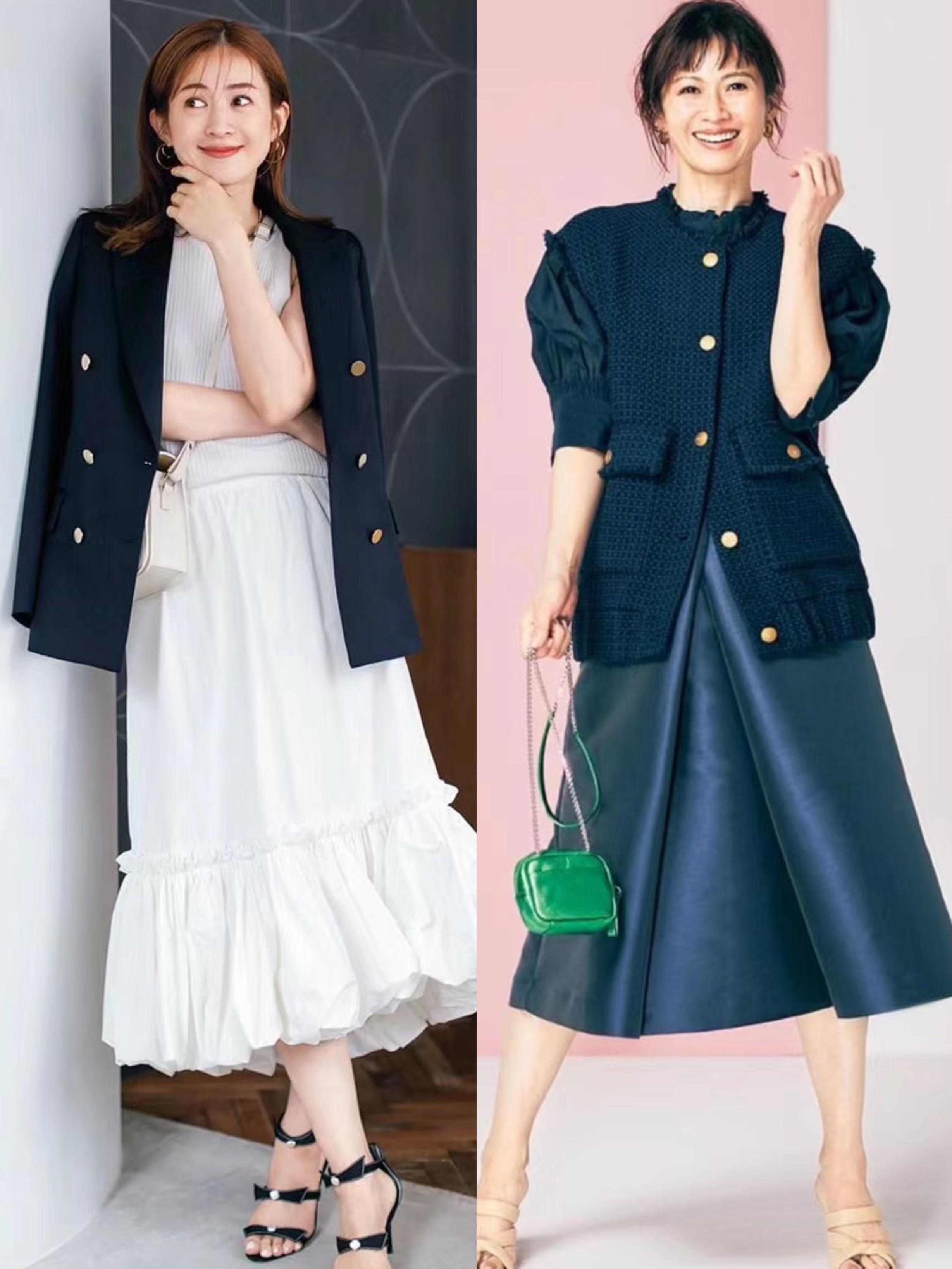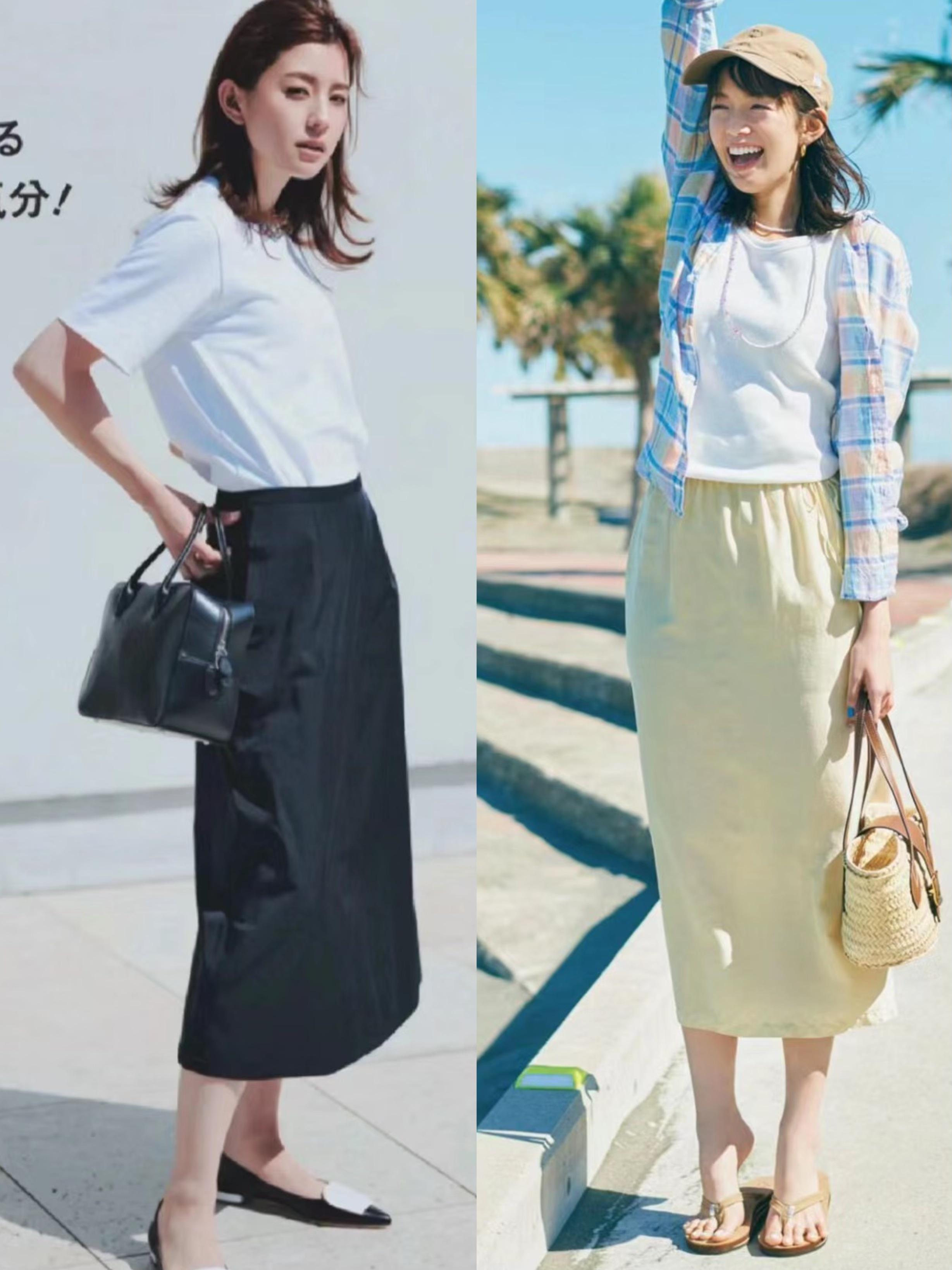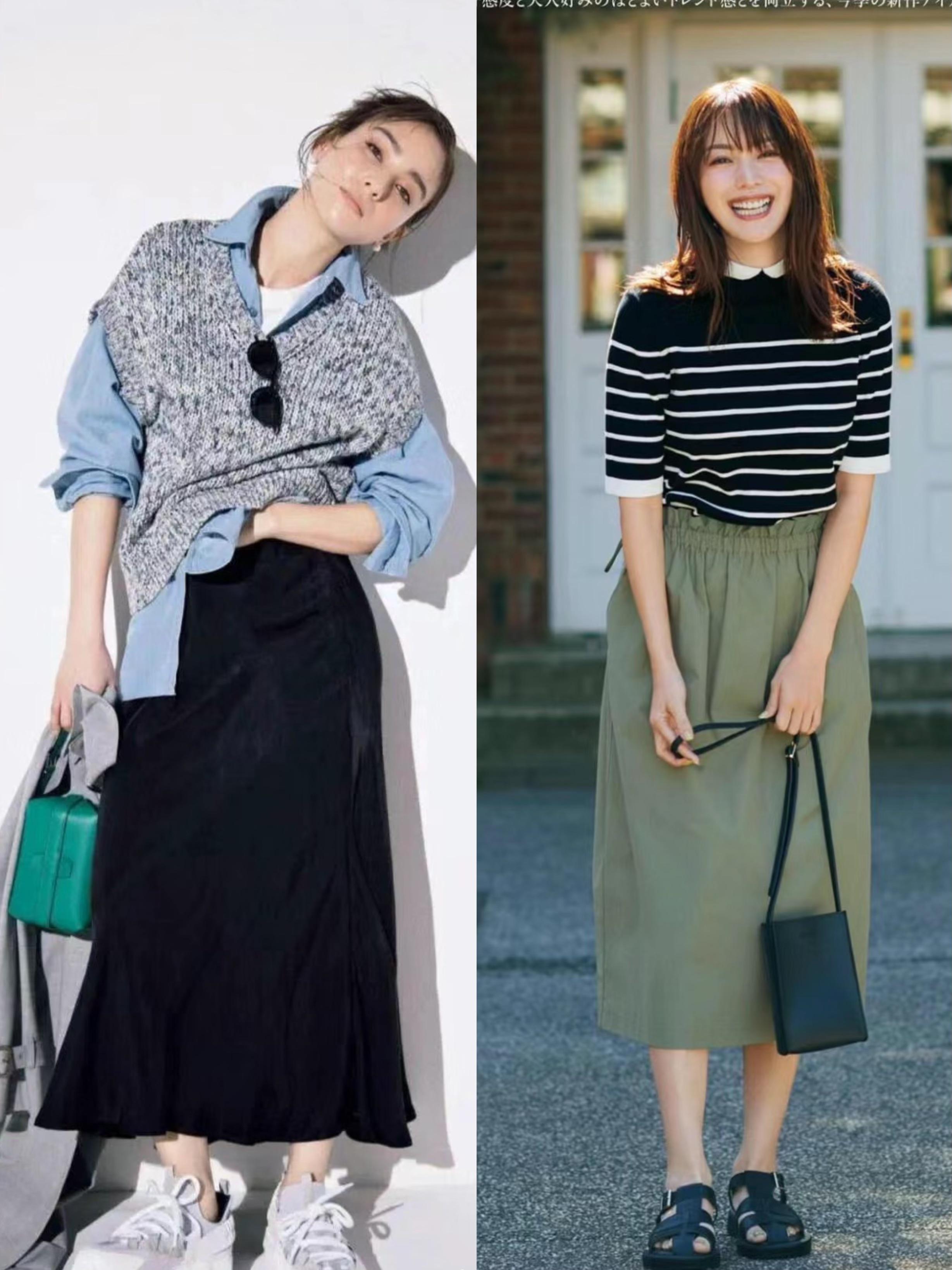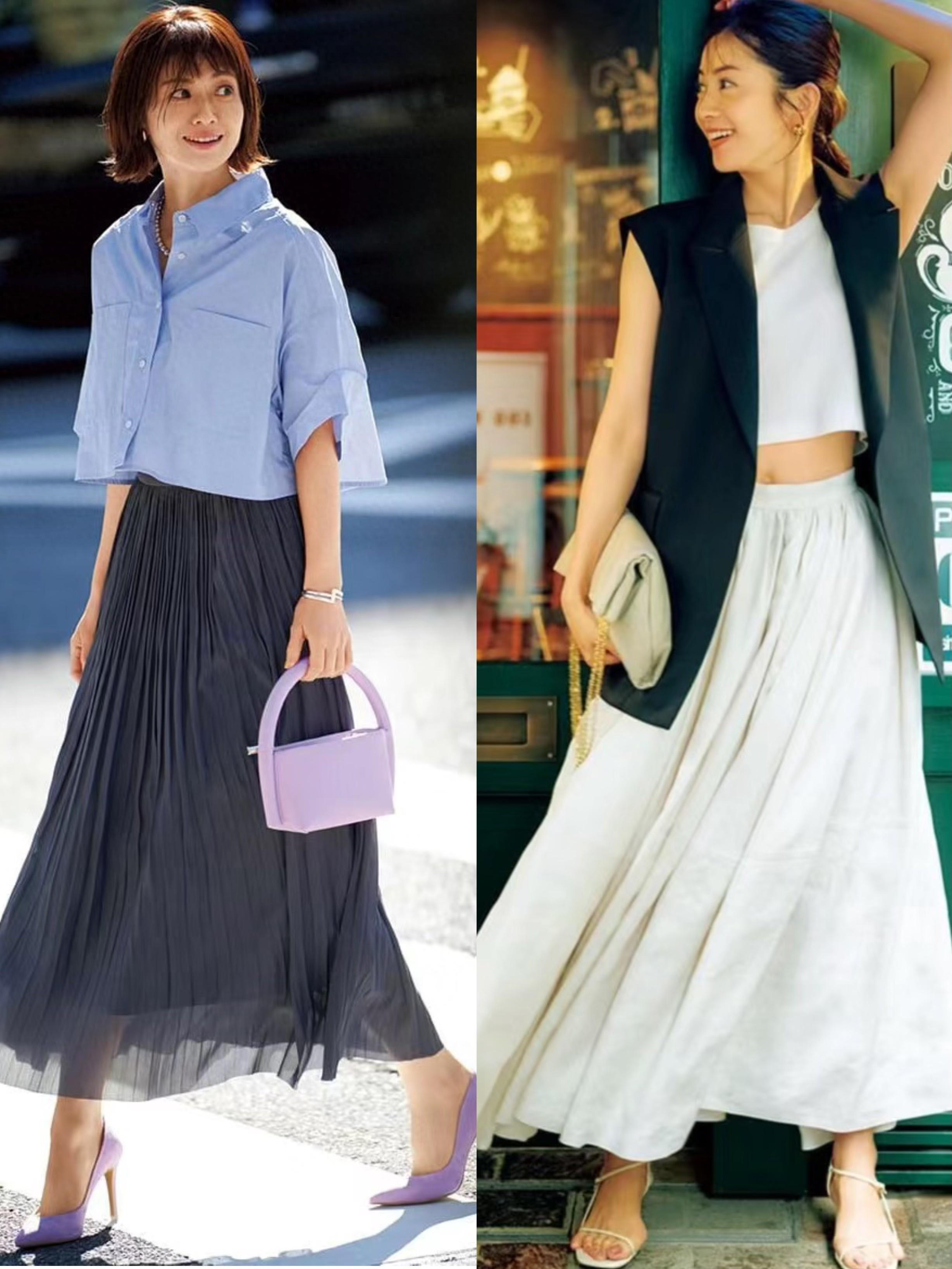 中年女性的高級美,與醋酸半身裙的材質更加相配。醋酸面料不像真絲那麼貴重,市面和質感卻比較相似,是一種更好的替代品。夏天裏的醋酸半身裙,選擇過膝長度更顯優雅。