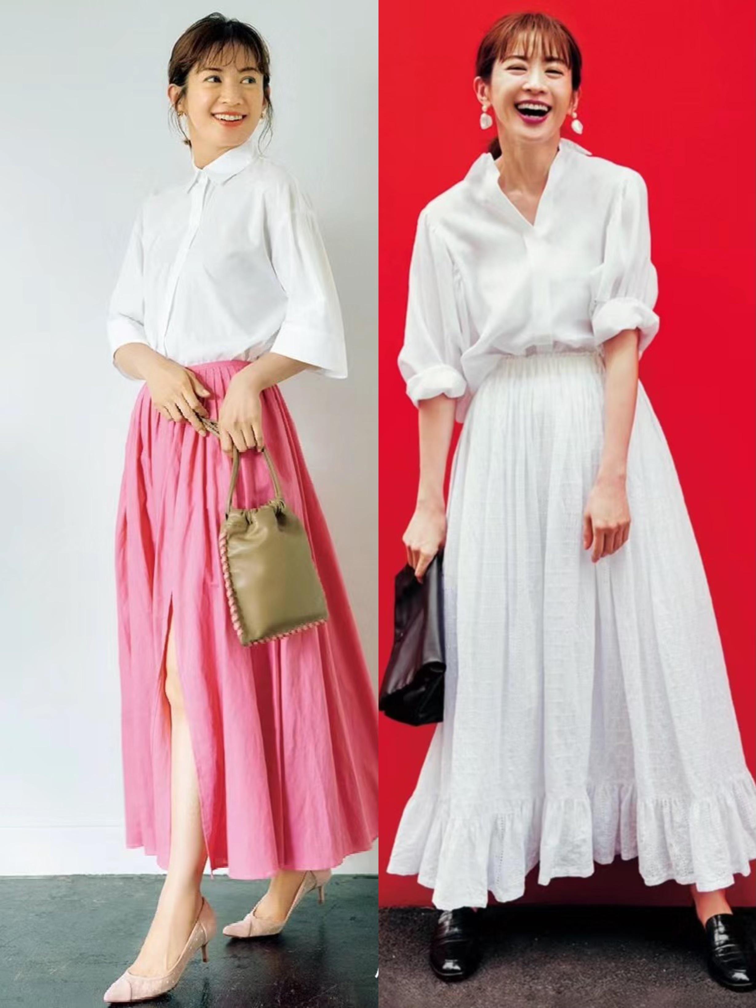 高腰的白色百褶半身裙,在夏天裏穿起來格外溫柔。稍微帶有膨脹感的裙襬,可以更好的修飾身形。在空調房裏搭一件西服外套、也是頗具氣場的。