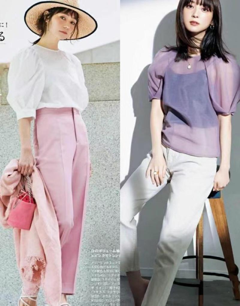 哪怕是粉色系的錐形褲,搭配白色泡泡袖襯衫也更溫婉起來。