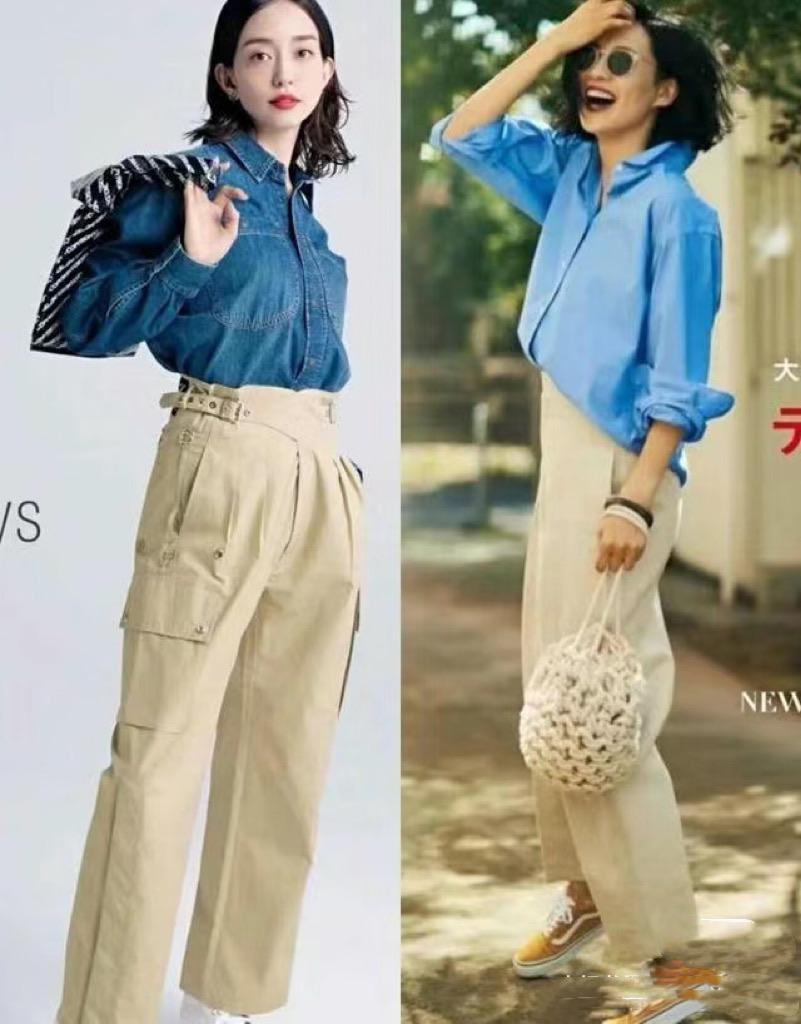 挺闊且利落的藍色襯衫,可以配高腰的工裝風長褲來穿着。藍色+卡其色的配色,更多了高級美,藍色襯衫的穿搭,也更具高級範和力量感。