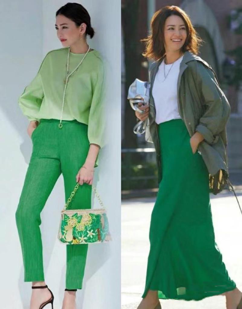 以淺綠色的上衣,來搭配深綠色的錐形褲,面料、色彩的過渡都那麼自然。