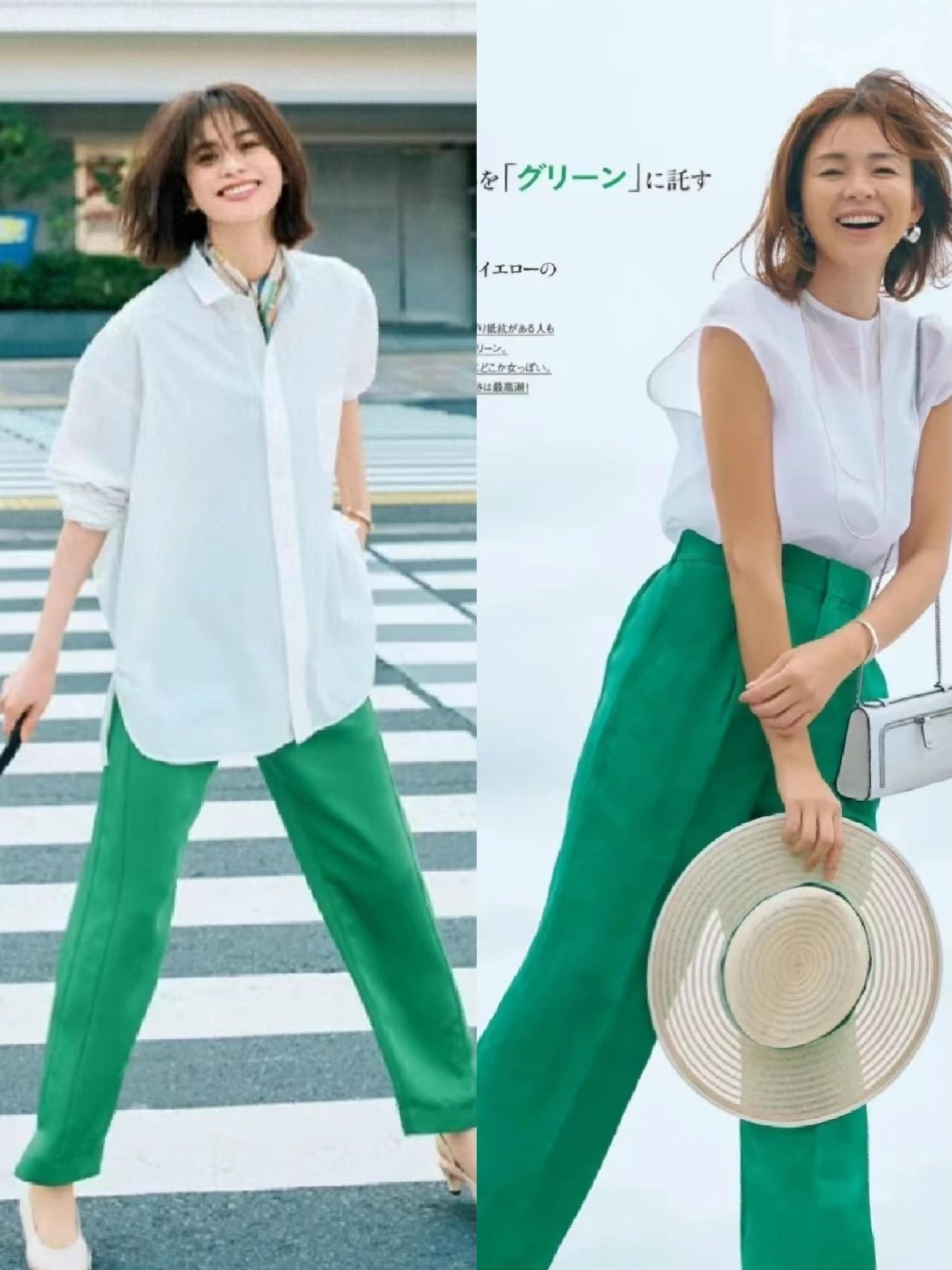 一條高腰的綠色長褲,簡單清爽、又大方的醒目。
