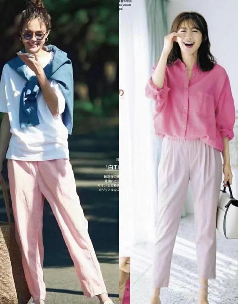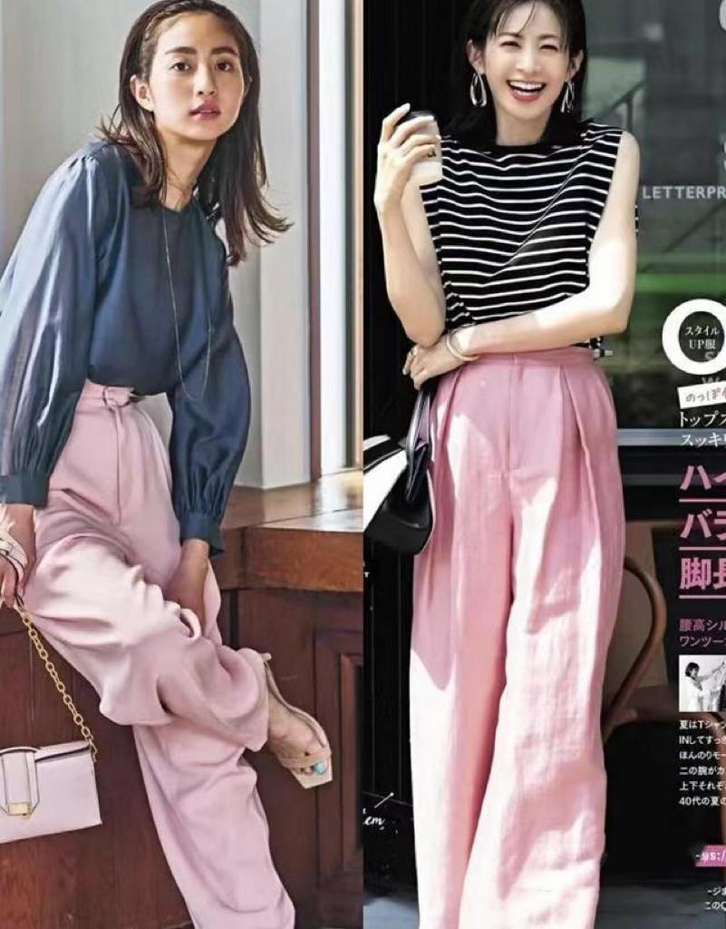 淺粉色或者裸粉色的長褲,既可以抬高腰線、又不會那麼浮誇。